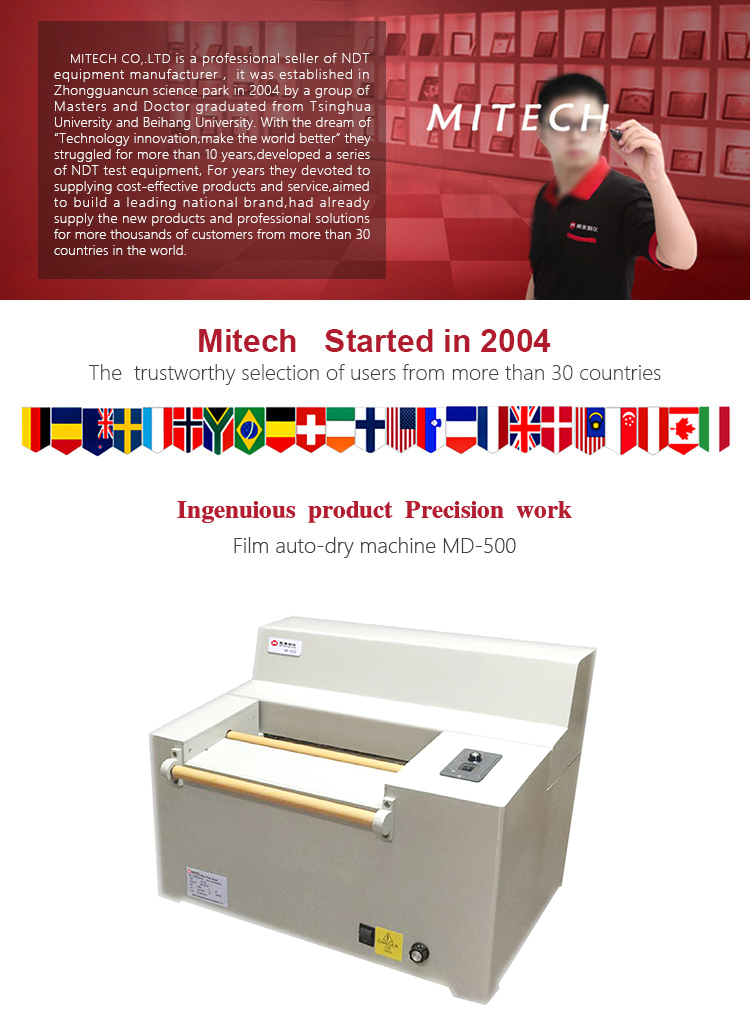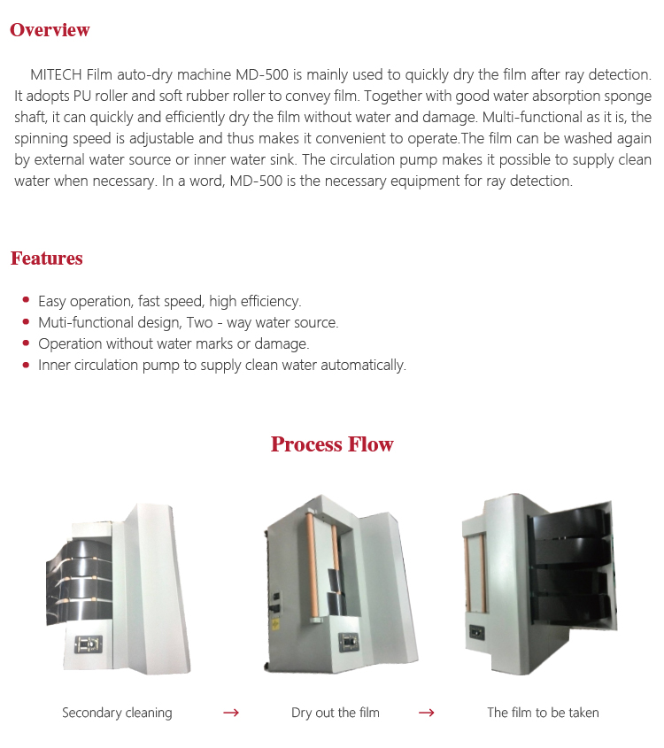 Product OverviewMITECH Film auto-dry machine MD-500 is mainly used to quickly dry the film after ray detection. It adopts PU roller and soft rubber roller to convey film. Together with good water absorption sponge shaft, it can quickly and efficiently dry the film without water and damage. Multi-functional as it is, the spinning speed is adjustable and thus makes it convenient to operate.The film can be washed again by external water source or inner water sink. The circulation pump makes it possible to supply clean water when necessary. In a word, MD-500 is the necessary equipment for ray detection.