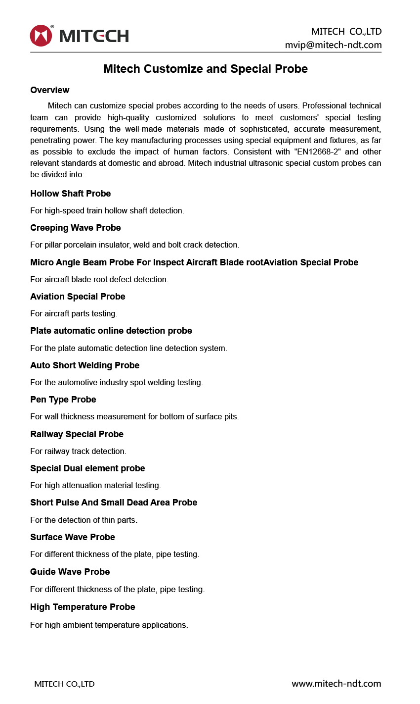 Mitech can customize special probes according to the needs of users. Professional technical team can provide high-quality customized solutions to meet customers' special testing requirements. Using the well-made materials made of sophisticated, accurate measurement, penetrating power. The key manufacturing processes using special equipment and fixtures, as far as possible to exclude the impact of human factors. Consistent with "EN12668-2" and other relevant standards at domestic and abroad