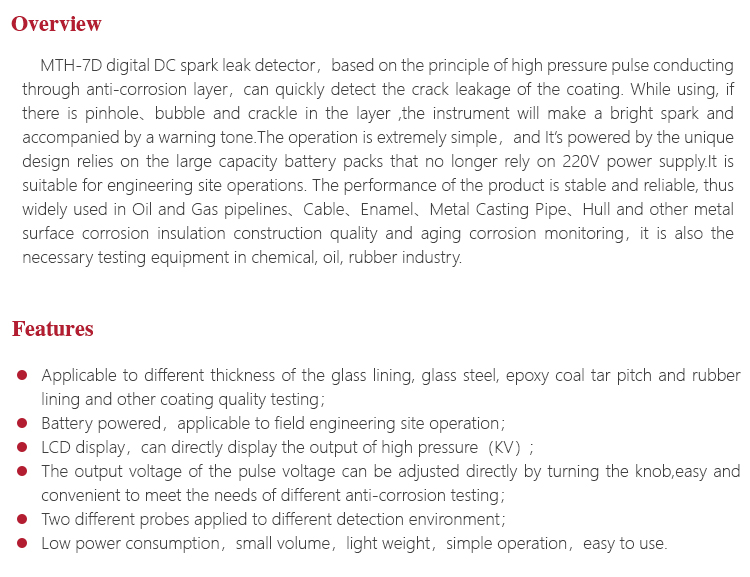 MTH-7D digital DC spark leak detector,based on the principle of high pressure pulse conducting through anti-corrosion layer,can quickly detect the crack leakage of the coating. While using, if there is pinhole、bubble and crackle in the layer ,the instrument will make a bright spark and accompanied by a warning tone.The operation is extremely simple,and It’s powered by the unique design relies on the large capacity battery packs that no longer rely on 220V power supply.It is suitable for engineering site operations. The performance of the product is stable and reliable, thus widely used in Oil and Gas pipelines、Cable、Enamel、Metal Casting Pipe、Hull and other metal surface corrosion insulation construction quality and aging corrosion monitoring,it is also the necessary testing equipment in chemical, oil, rubber industry.