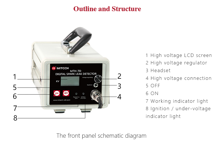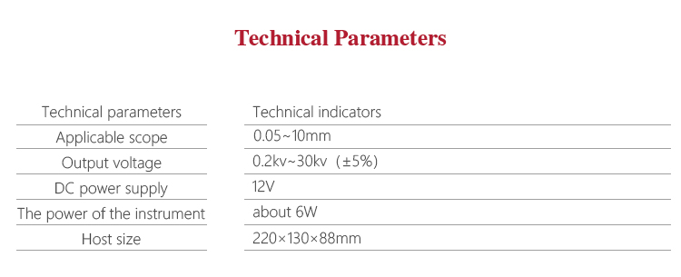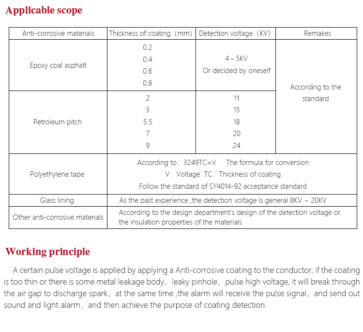 A certain pulse voltage is applied by applying a Anti-corrosive coating to the conductor, if the coating is too thin or there is some metal leakage body、leaky pinhole,pulse high voltage, it will break through the air gap to discharge spark,at the same time ,the alarm will receive the pulse signal,and send out sound and light alarm,and then achieve the purpose of coating detection.