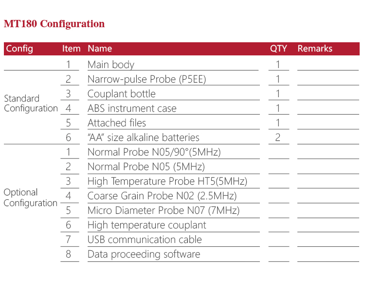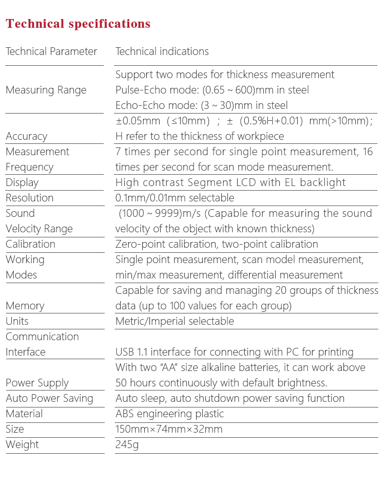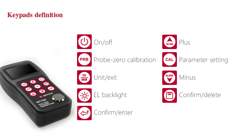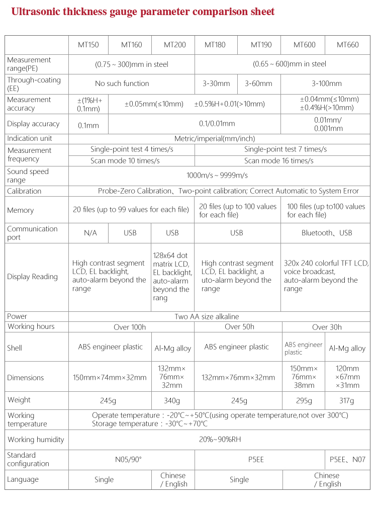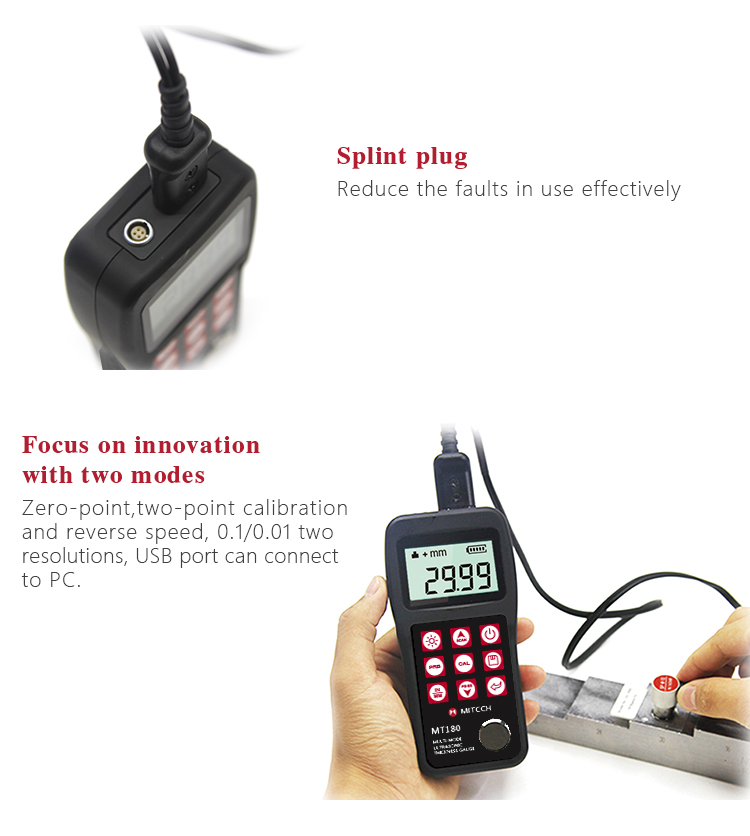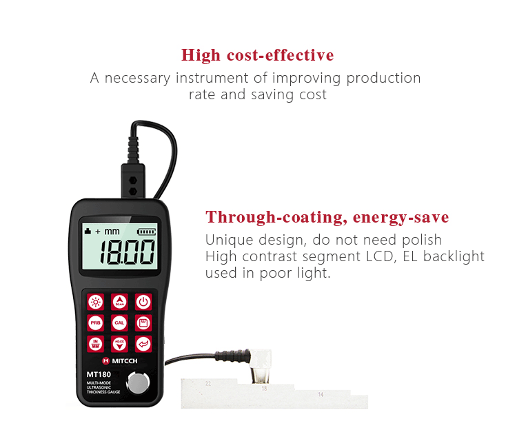 Product OverviewMiteh MT180 multi-mode ultrasonic thickness gauge, based on ultrasonic measuring principle, it can perform thickness measurements on a wide range of materials including metals, plastic, ceramics glass and other ultrasonic well-conductive materials. It is also capable for measuring the sound velocity of the object with known thickness. Compared with the traditional measurement method, the advantage of ultrasonic thickness gauge is that it can finish the measurement only if it contacts with one side of the measured workpiece. Its unique performance of capable for testing thickness through the coating provides efficient solution for testing the workpiece of coated surface or corrosion materials. It can test the workpiece directly without needing to get rid of the surface coating. It’s widely used for monitoring the production equipments’ various pipelines and pressure vessel corrosion reducing degree in the fields of petroleum, chemical, metallurgy, shipbuilding, aviation, aerospace and so on. It also can be used for making accurate measurement to various plates and machining parts. It is the necessary professional precision instrument for improving the production efficiency and qualification rate as well as saving cost.