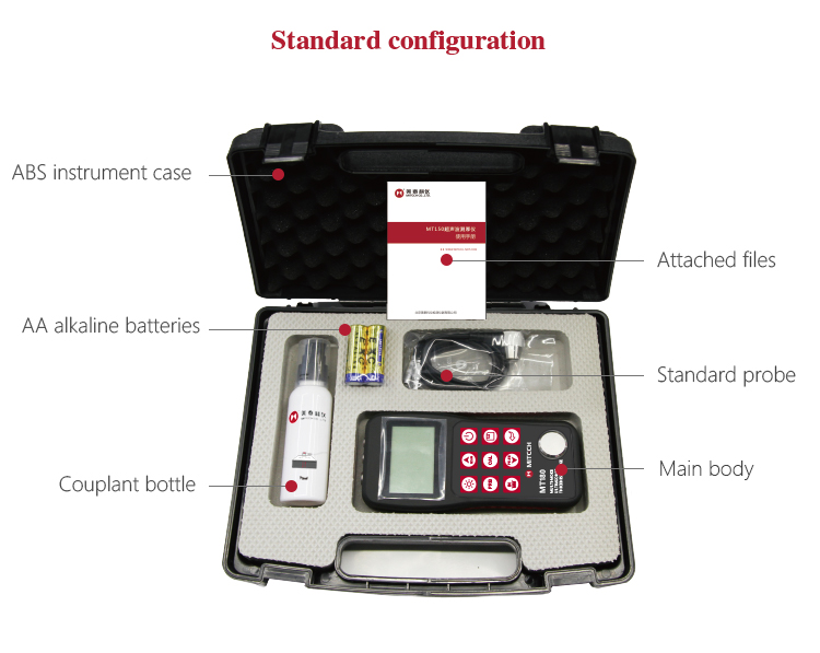 The instrument case of Mitech ultrasonic thickness gauge, length: 27cm, width: 22.5cm, height: 7.5cm and weight: 0.698kg, designed with ABS engineering plastic, It has excellent performance like waterproof, shockproof, excellent heat resistance and low temperature resistance. It can effectively prevent oil, dust and corrosion in harsh environment. Its size in line with the standards for aviation and train carrying (capable of putting under the seat and on the luggage rack), it is safe, reliable and stable.