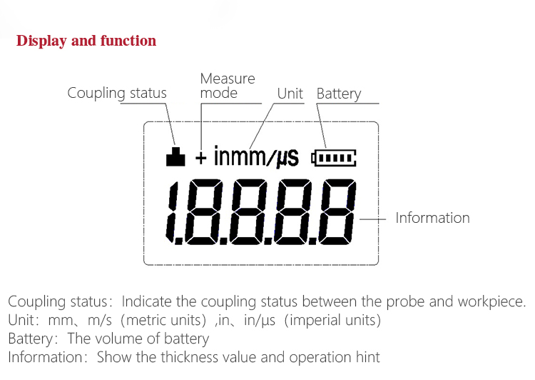 Instrument MaintenanceWhen the thickness gauge appears some other abnormal phenomena, please do not dismantle or adjust any fixedly assembled parts. Fill in and present the warranty card to us. The warranty service can be carried on. Keep it away from vibration, strong magnetic field, corrosive medium, dumpiness and dust. Storage in ordinary temperature. With Original packing, transport is allowed on the third grade highway.