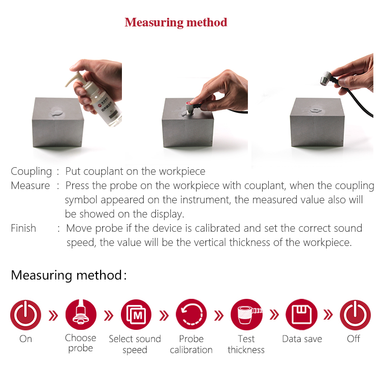 The velocity of sound through a substance is dependant upon its temperature. As materials heat up, the velocity of sound through them decreases. In most applications with surface temperatures less than about 100℃, no special procedures must be observed. At temperatures above this point, the change in sound velocity of the material being measured starts to have a noticeable effect upon ultrasonic measurement. At such elevated temperatures, it is recommended that the user perform a calibration procedure on a sample piece of known thickness, which is at or near the temperature of the material to be measured. This will allow the gauge to correctly calculate the velocity of sound through the hot material.