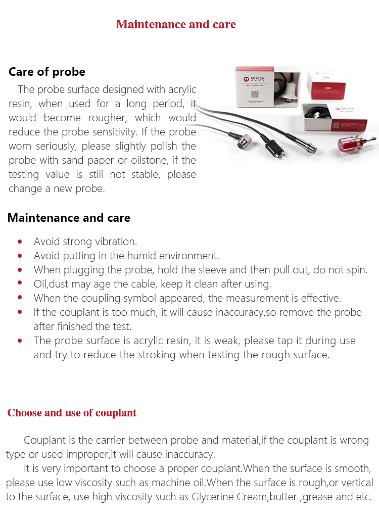 The couplant coated on the probe and the measured workpiece surface as the medium to isolate the air between them, selecting the proper viscosity couplant is the critical thing for the precisely measurement. Mitech series ultrasonic thickness gauge standard 75mm ultrasonic special couplant in the configuration for isolating the air between the ultrasonic probe and the workpiece surface, which can make probe produced ultrasonic wave into the workpiece effectively to ensure the accurate measurement of thickness. The couplant with squeeze bottle packing, it is clean and environmental. It is recommended to select the low viscosity couplant for measuring the smooth material and select the high viscosity couplant (like glycerine cream, butter and so on) for measuring the rough material.