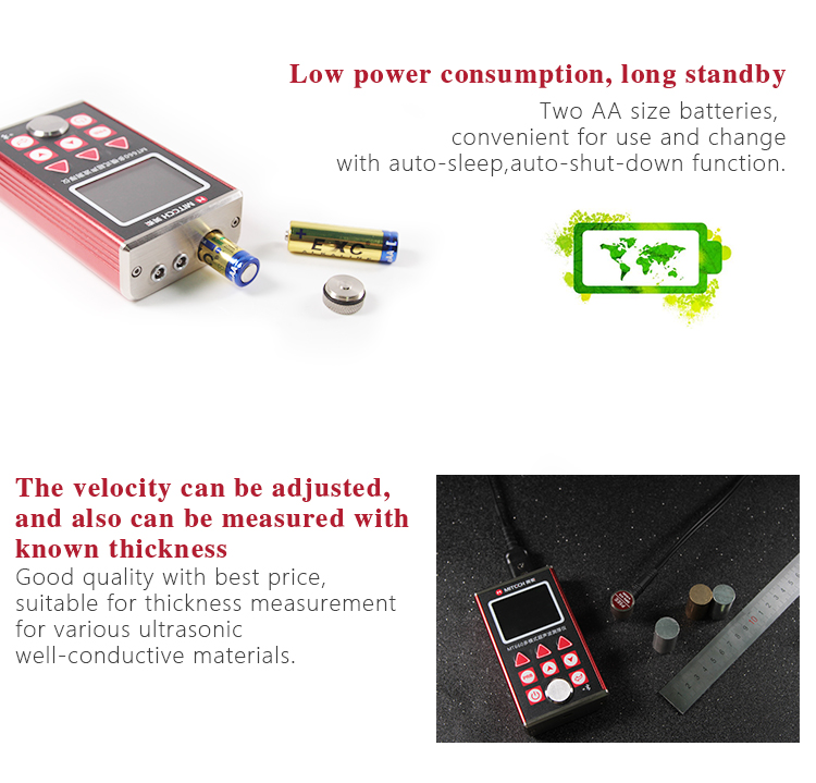 Mitech series ultrasonic thickness gauges, with low-power design and long standby, MT150/MT160/MT200/MT180/MT190/MT600/MT660 are with two AA size alkaline batteries for power supply, easy to replace.