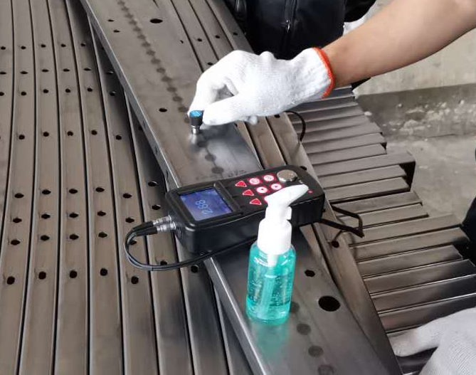 首先進(jìn)行焊接部位和未焊接部位對比,此次測試板材厚度規(guī)格為1.4mm,兩層板材疊焊檢測厚度理論值為2.8mm。若顯示數(shù)值為1.4mm,則表示焊接并未焊透;若顯示數(shù)值在1.4-2.0mm之間則表示焊點熔深直徑過小。工程師細(xì)心為該廠技術(shù)人員講解了檢測的原理。