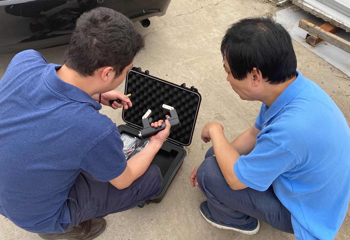 在車間,教授為我們講解了高鐵車廂的結(jié)構(gòu)構(gòu)成,和工件的整體結(jié)構(gòu)構(gòu)成及工作承重環(huán)境。了解了工件的大體結(jié)構(gòu)后,美泰工程師首先使用美泰超聲波測(cè)厚儀和涂層測(cè)厚儀對(duì)工件板材、管件厚度及表面涂層厚度基本參數(shù)進(jìn)行測(cè)量,而后使用美泰超聲波探傷儀對(duì)待檢焊縫進(jìn)行實(shí)地探傷試驗(yàn)。