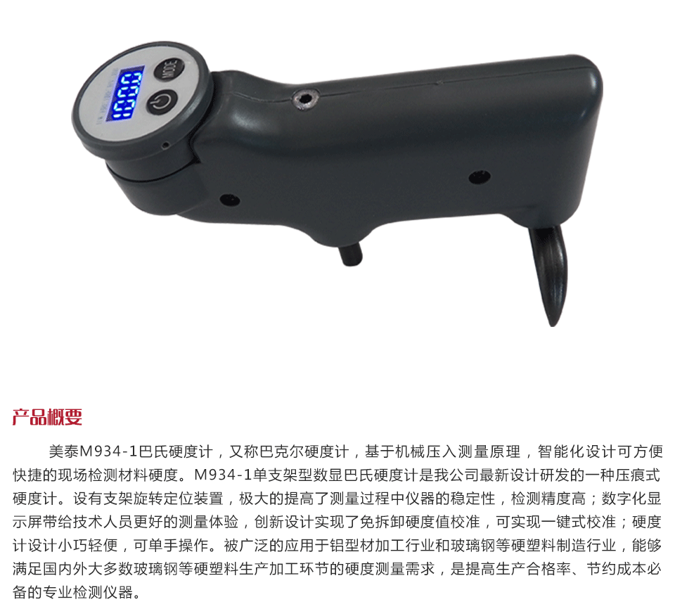 美泰M934-1巴氏硬度計,又稱巴克爾硬度計,基于機(jī)械壓入測量原理,智能化設(shè)計可方便快捷的現(xiàn)場檢測材料硬度。M934-1單支架型數(shù)顯巴氏硬度計是我公司最新設(shè)計研發(fā)的一種壓痕式硬度計。設(shè)有支架旋轉(zhuǎn)定位裝置,極大的提高了測量過程中儀器的穩(wěn)定性,檢測精度高;數(shù)字化顯示屏帶給技術(shù)人員更好的測量體驗,創(chuàng)新設(shè)計實現(xiàn)了免拆卸硬度值校準(zhǔn),可實現(xiàn)一鍵式校準(zhǔn);硬度計設(shè)計小巧輕便,可單手操作。被廣泛的應(yīng)用于鋁型材加工行業(yè)和玻璃鋼等硬塑料制造行業(yè),能夠滿足國內(nèi)外大多數(shù)玻璃鋼等硬塑料生產(chǎn)加工環(huán)節(jié)的硬度測量需求,是提高生產(chǎn)合格率、節(jié)約成本必備的專業(yè)檢測儀器。