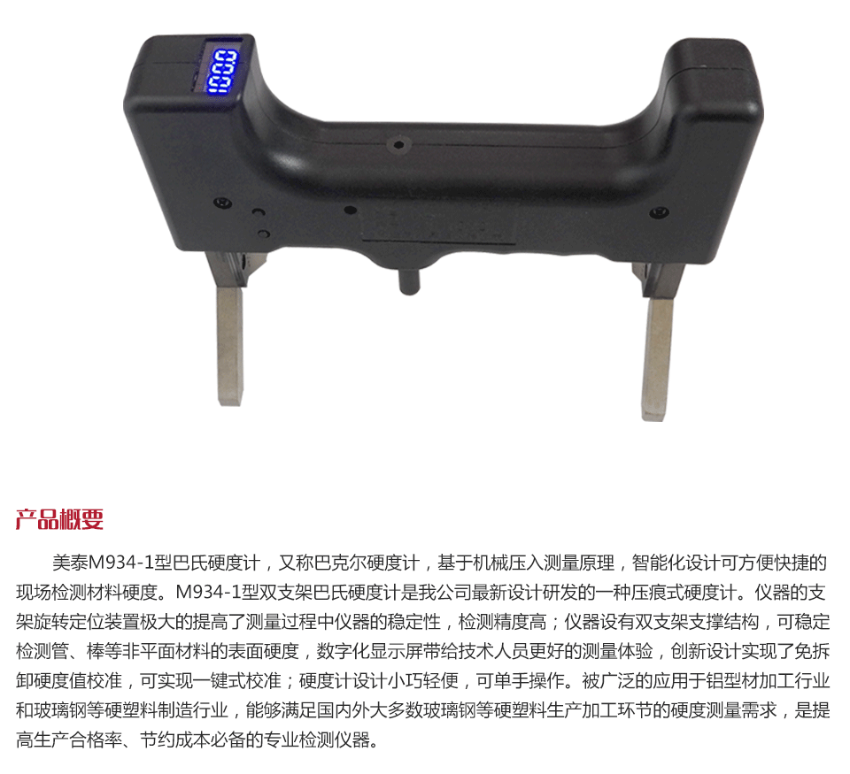 美泰M934-1型巴氏硬度計,又稱巴克爾硬度計,基于機械壓入測量原理,智能化設(shè)計可方便快捷的現(xiàn)場檢測材料硬度。M934-1型雙支架巴氏硬度計是我公司最新設(shè)計研發(fā)的一種壓痕式硬度計。儀器的支架旋轉(zhuǎn)定位裝置極大的提高了測量過程中儀器的穩(wěn)定性,檢測精度高;儀器設(shè)有雙支架支撐結(jié)構(gòu),可穩(wěn)定檢測管、棒等非平面材料的表面硬度,數(shù)字化顯示屏帶給技術(shù)人員更好的測量體驗,創(chuàng)新設(shè)計實現(xiàn)了免拆卸硬度值校準,可實現(xiàn)一鍵式校準;硬度計設(shè)計小巧輕便,可單手操作。被廣泛的應(yīng)用于鋁型材加工行業(yè)和玻璃鋼等硬塑料制造行業(yè),能夠滿足國內(nèi)外大多數(shù)玻璃鋼等硬塑料生產(chǎn)加工環(huán)節(jié)的硬度測量需求,是提高生產(chǎn)合格率、節(jié)約成本必備的專業(yè)檢測儀器。