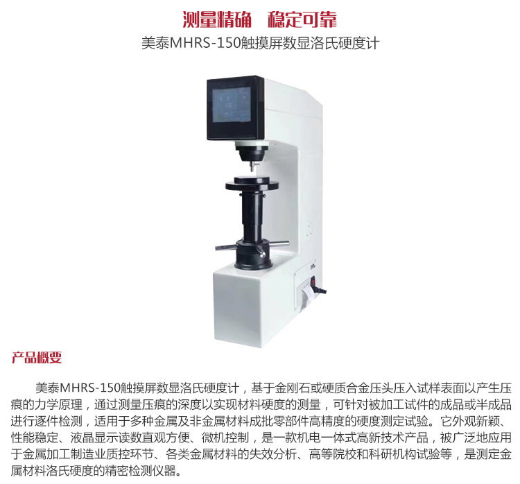 產品概述美泰MHRS-150觸摸屏數顯洛氏硬度計,基于金剛石或硬質合金壓頭壓入試樣表面以產生壓痕的力學原理,通過測量壓痕的深度以實現(xiàn)材料硬度的測量,可針對被加工試件的成品或半成品進行逐件檢測,適用于多種金屬及非金屬材料成批零部件高精度的硬度測定試驗。它外觀新穎、性能穩(wěn)定、液晶顯示讀數直觀方便、微機控制,是一款機電一體式高新技術產品,被廣泛地應用于金屬加工制造業(yè)質控環(huán)節(jié)、各類金屬材料的失效分析、高等院校和科研機構試驗等,是測定金屬材料洛氏硬度的精密檢測儀器。