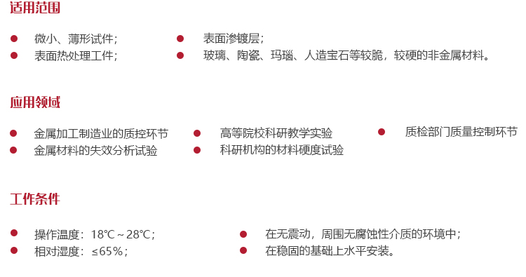 儀器特點?廣泛適用于微小試件、薄形試件、熱處理工件等進行表面(滲鍍層)的維氏硬度試驗,可滿足科研機構、精密的加工制造業(yè)及質檢部門等材料試驗的需求;