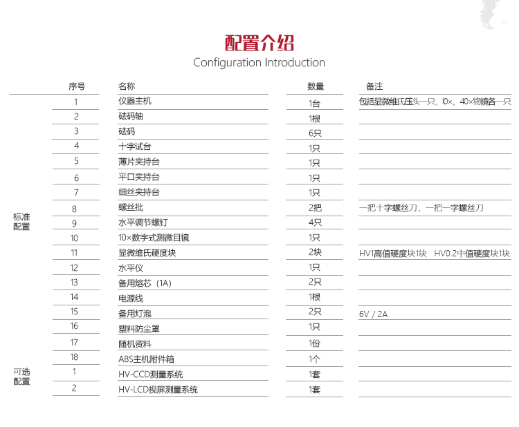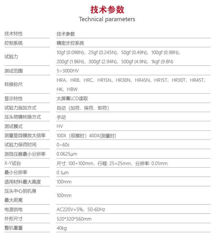 | 試驗力 | 10gf (0.098N)、25gf (0.245N)、50gf (0.49N)、100gf (0.98N)、 200gf (1.96N)、300gf (2.94N)、500gf (4.9N)、1kg |