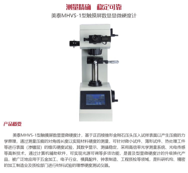 美泰MHVS-1型觸摸屏數(shù)顯顯微硬度計,基于正四棱錐形金剛石壓頭壓入試樣表面以產生壓痕的力學原理,通過測量壓痕的對角線長度以實現(xiàn)材料硬度的測量,可針對微小試件、薄形試件、熱處理工件等進行表面(滲鍍層)的維氏硬度試驗,其數(shù)字顯示、測值穩(wěn)定,采用高倍率光學測量系統(tǒng)、光電傳感等高新技術,通過計算機輔助軟件,可實現(xiàn)光源可調等多項功能,是普及型顯微硬度計的升級換代產品,被廣泛地應用于五金加工、電子行業(yè)、模具配件、鐘表制造、工程質檢等領域,是科研機構、精密的加工制造業(yè)及質檢部門進行材料試驗的理想硬度測試儀器。