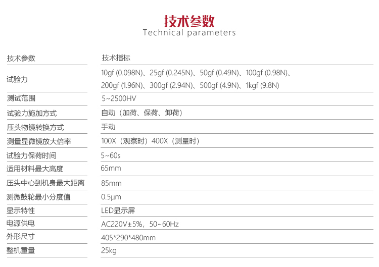 | 試驗(yàn)力 | 10gf (0.098N)、25gf (0.245N)、50gf (0.49N)、100gf (0.98N)、 200gf (1.96N)、300gf (2.94N)、500gf (4.9N)、1kg |