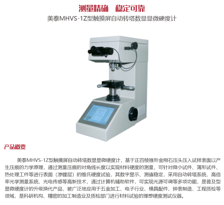 美泰MHVS-1Z型觸摸屏自動轉(zhuǎn)塔數(shù)顯顯微硬度計,基于正四棱錐形金剛石壓頭壓入試樣表面以產(chǎn)生壓痕的力學(xué)原理,通過測量壓痕的對角線長度以實(shí)現(xiàn)材料硬度的測量,可針對微小試件、薄形試件、熱處理工件等進(jìn)行表面(滲鍍層)的維氏硬度試驗(yàn),其數(shù)字顯示、測值穩(wěn)定,采用自動轉(zhuǎn)塔系統(tǒng)、高倍率光學(xué)測量系統(tǒng)、光電傳感等高新技術(shù),通過計算機(jī)輔助軟件,可實(shí)現(xiàn)光源可調(diào)等多項功能,是普及型顯微硬度計的升級換代產(chǎn)品,被廣泛地應(yīng)用于五金加工、電子行業(yè)、模具配件、鐘表制造、工程質(zhì)檢等領(lǐng)域,是科研機(jī)構(gòu)、精密的加工制造業(yè)及質(zhì)檢部門進(jìn)行材料試驗(yàn)的理想硬度測試儀器。