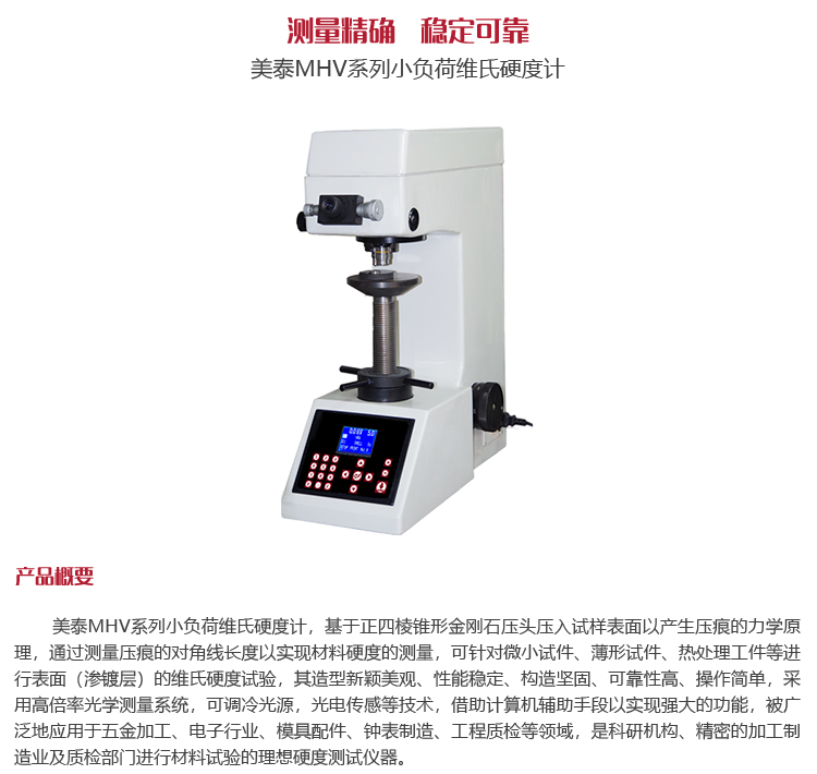 產(chǎn)品概述美泰MHV系列小負(fù)荷維氏硬度計(jì),基于正四棱錐形金剛石壓頭壓入試樣表面以產(chǎn)生壓痕的力學(xué)原理,通過測(cè)量壓痕的對(duì)角線長度以實(shí)現(xiàn)材料硬度的測(cè)量,可針對(duì)微小試件、薄形試件、熱處理工件等進(jìn)行表面(滲鍍層)的維氏硬度試驗(yàn),其造型新穎美觀、性能穩(wěn)定、構(gòu)造堅(jiān)固、可靠性高、操作簡單,采用高倍率光學(xué)測(cè)量系統(tǒng),可調(diào)冷光源,光電傳感等技術(shù),借助計(jì)算機(jī)輔助手段以實(shí)現(xiàn)強(qiáng)大的功能,被廣泛地應(yīng)用于五金加工、電子行業(yè)、模具配件、鐘表制造、工程質(zhì)檢等領(lǐng)域,是科研機(jī)構(gòu)、精密的加工制造業(yè)及質(zhì)檢部門進(jìn)行材料試驗(yàn)的理想硬度測(cè)試儀器。