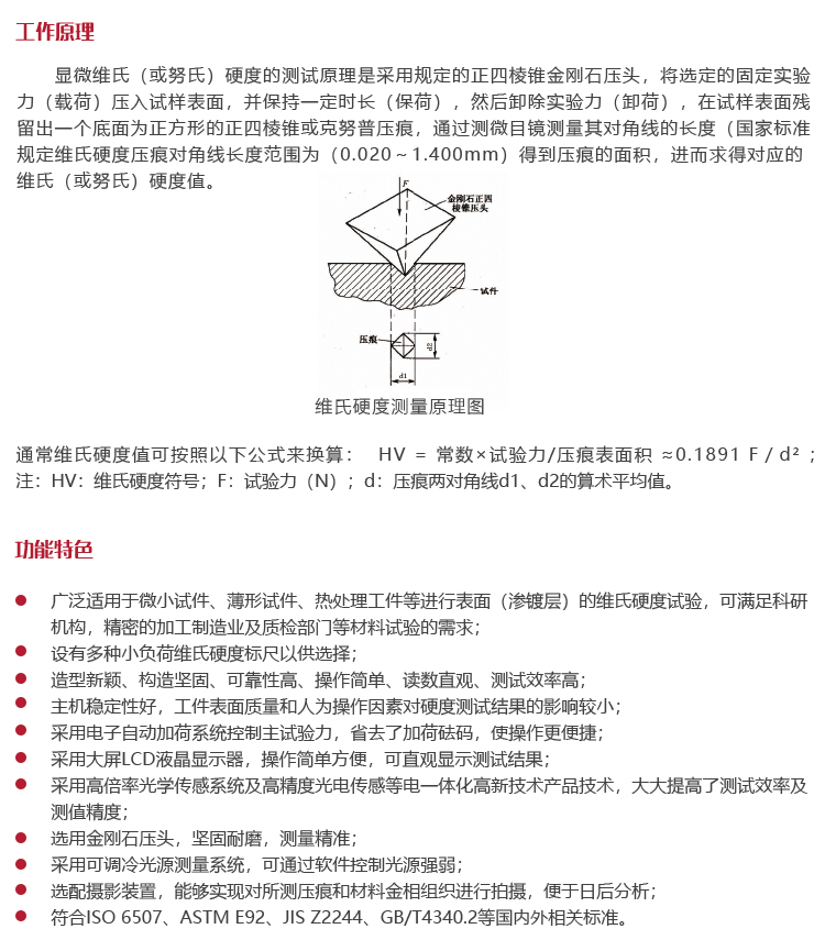 符合ISO 6507、ASTM E92、JIS Z2244、GB/T4340.2等國內(nèi)外相關(guān)標(biāo)準(zhǔn)。