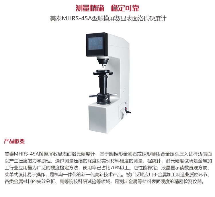 美泰MHRS-45A觸摸屏數(shù)顯表面洛氏硬度計(jì),基于圓錐形金剛石或球形硬質(zhì)合金壓頭壓入試樣淺表面以產(chǎn)生壓痕的力學(xué)原理,通過測量壓痕的深度以實(shí)現(xiàn)材料硬度的測量。據(jù)統(tǒng)計(jì),洛氏硬度試驗(yàn)是金屬加工行業(yè)應(yīng)用最為廣泛的硬度檢定方法,使用率已占比70%以上。它性能穩(wěn)定、液晶顯示讀數(shù)直觀方便、菜單式設(shè)計(jì)易于操作,是機(jī)電一體化的新一代高新技術(shù)產(chǎn)品。被廣泛地應(yīng)用于金屬加工制造業(yè)質(zhì)控環(huán)節(jié)、各類金屬材料的失效分析、高等院校科研試驗(yàn)等領(lǐng)域,是測定金屬等材料表面硬度的精密檢測儀器。