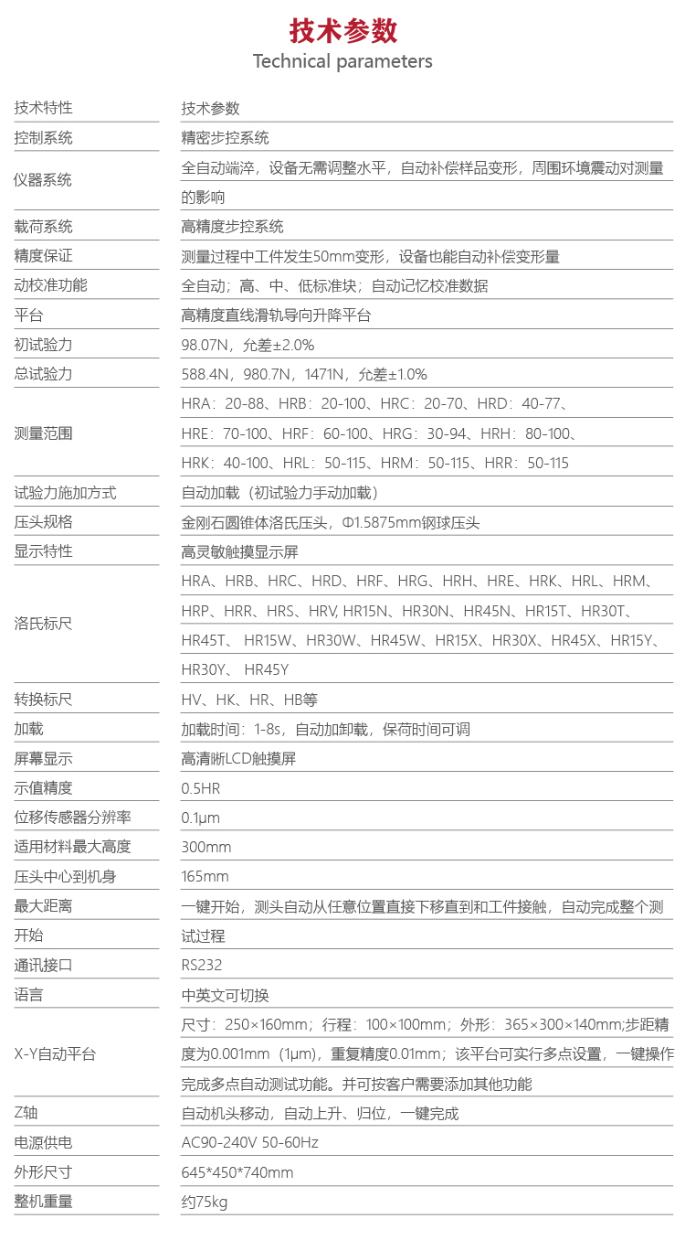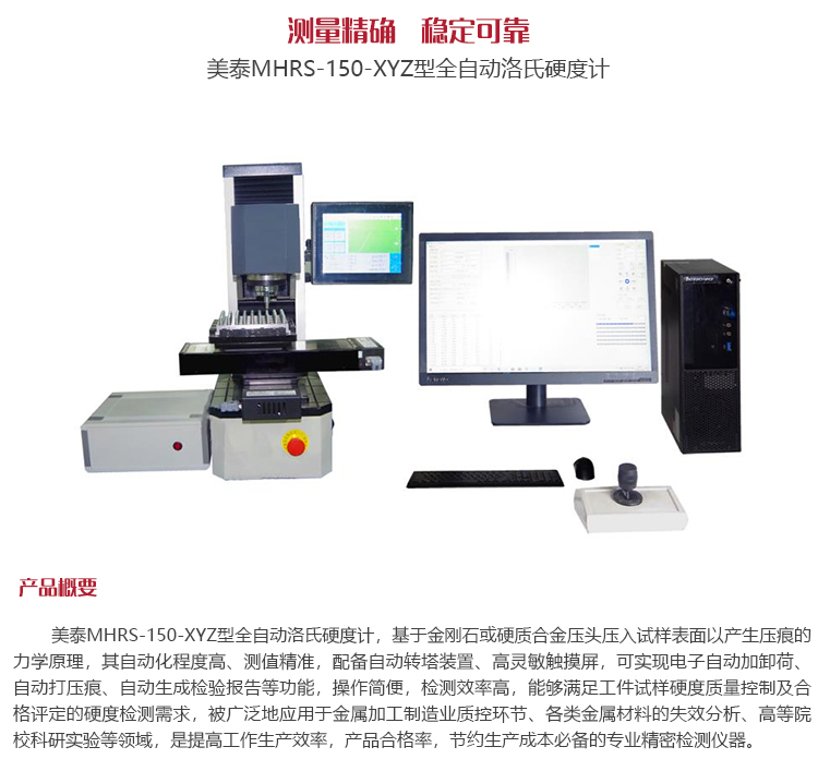 美泰MHRS-150-XYZ型全自動(dòng)洛氏硬度計(jì),基于金剛石或硬質(zhì)合金壓頭壓入試樣表面以產(chǎn)生壓痕的力學(xué)原理,其自動(dòng)化程度高、測(cè)值精準(zhǔn),配備自動(dòng)轉(zhuǎn)塔裝置、高靈敏觸摸屏,可實(shí)現(xiàn)電子自動(dòng)加卸荷、自動(dòng)打壓痕、自動(dòng)生成檢驗(yàn)報(bào)告等功能,操作簡(jiǎn)便,檢測(cè)效率高,能夠滿足工件試樣硬度質(zhì)量控制及合格評(píng)定的硬度檢測(cè)需求,被廣泛地應(yīng)用于金屬加工制造業(yè)質(zhì)控環(huán)節(jié)、各類金屬材料的失效分析、高等院校科研實(shí)驗(yàn)等領(lǐng)域,是提高工作生產(chǎn)效率,產(chǎn)品合格率,節(jié)約生產(chǎn)成本必備的專業(yè)精密檢測(cè)儀器。