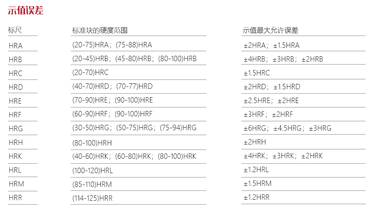 | 洛氏標(biāo)尺 | HRA、HRB、HRC、HRD、HRE、HRF、HRG、HRH、HRK、HRL、HRM、HRP、HRR、HRS、HRV |