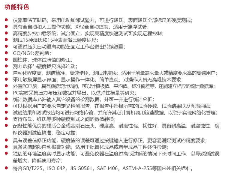 儀器特點(diǎn)?儀器取消了砝碼,采用電動(dòng)加卸試驗(yàn)力,可進(jìn)行洛氏、表面洛氏全部標(biāo)尺的硬度測(cè)試;