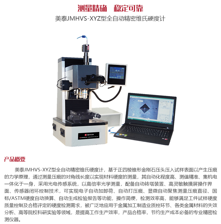 產(chǎn)品概述美泰JMHVS-XYZ型全自動精密維氏硬度計,基于正四棱錐形金剛石壓頭壓入試樣表面以產(chǎn)生壓痕的力學原理,通過測量壓痕的對角線長度以實現(xiàn)材料硬度的測量,其自動化程度高、測值精準、集機電一體化于一身,采用光電傳感系統(tǒng),以高倍率光學測量,配備自動轉(zhuǎn)塔裝置、高靈敏觸摸屏操作界面、傳感器閉環(huán)控制技術(shù)、可實現(xiàn)電子自動加卸荷、自動打壓痕、顯微自動聚焦測量壓痕直徑、國標/ASTM硬度自動換算、自動生成檢驗報告等功能,操作簡便,檢測效率高,能夠滿足工件試樣硬度質(zhì)量控制及合格評定的硬度檢測需求,被廣泛地應(yīng)用于金屬加工制造業(yè)質(zhì)控環(huán)節(jié)、各類金屬材料的失效分析、高等院校科研實驗等領(lǐng)域,是提高工作生產(chǎn)效率,產(chǎn)品合格率,節(jié)約生產(chǎn)成本必備的專業(yè)精密檢測儀器。