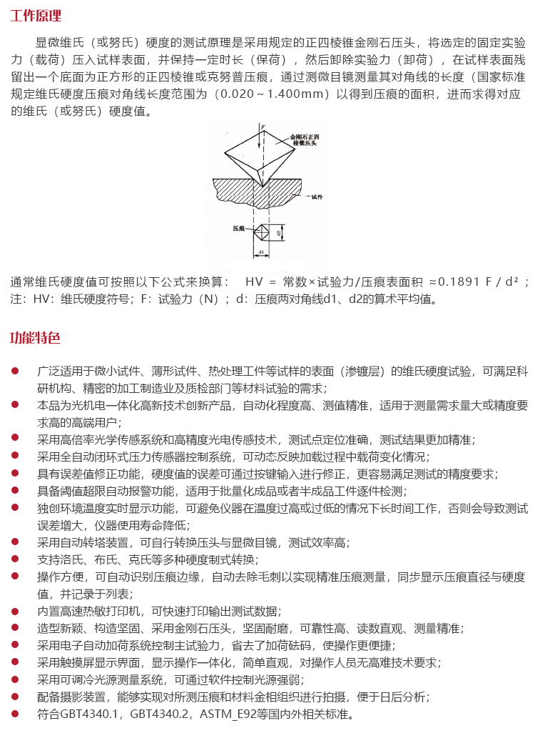 儀器特點廣泛適用于微小試件、薄形試件、熱處理工件等試樣的表面(滲鍍層)的維氏硬度試驗,可滿足科研機構(gòu)、精密的加工制造業(yè)及質(zhì)檢部門等材料研究和顯微硬度檢測的需求;