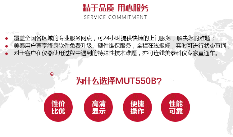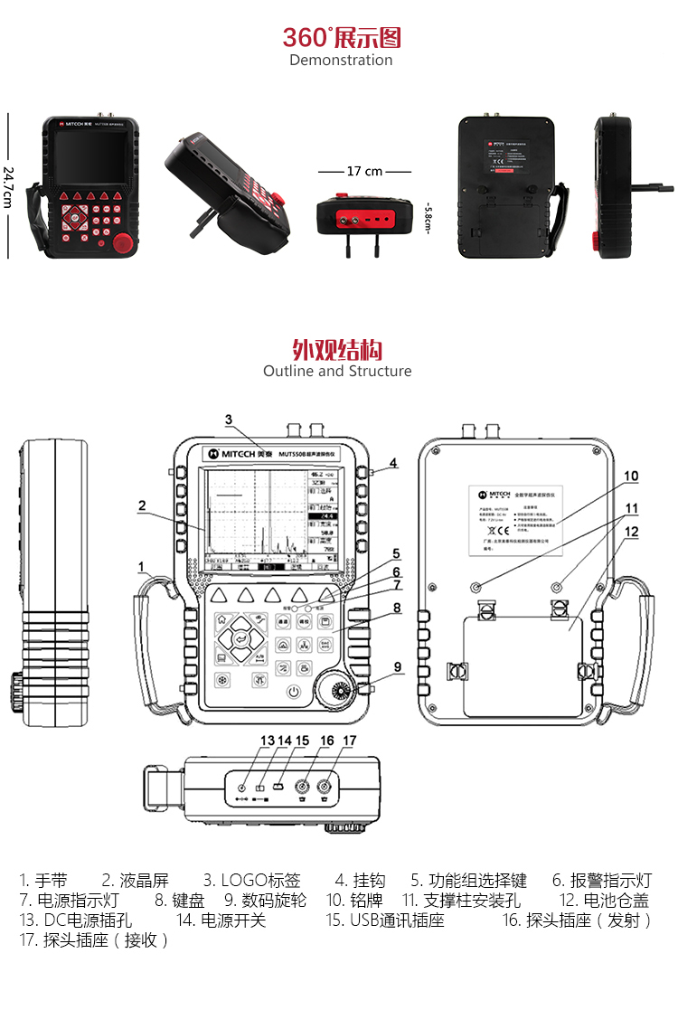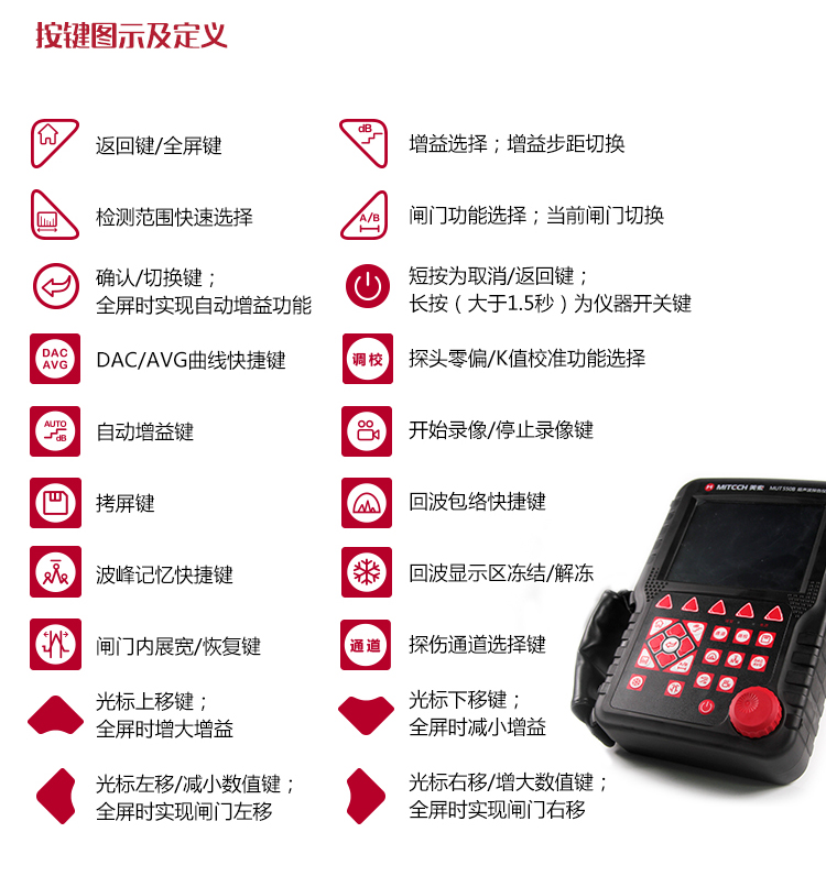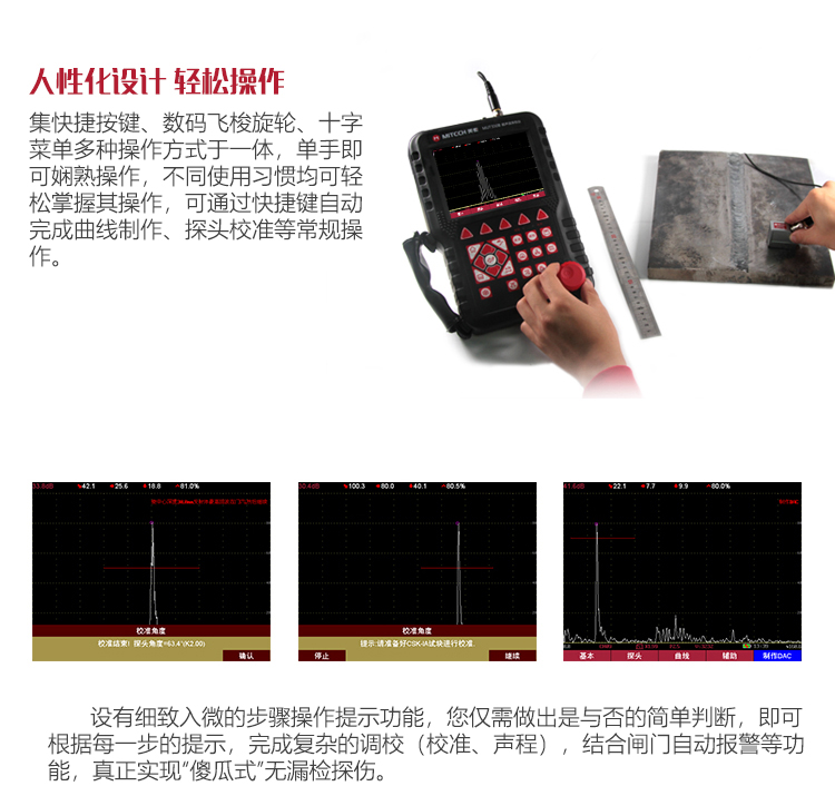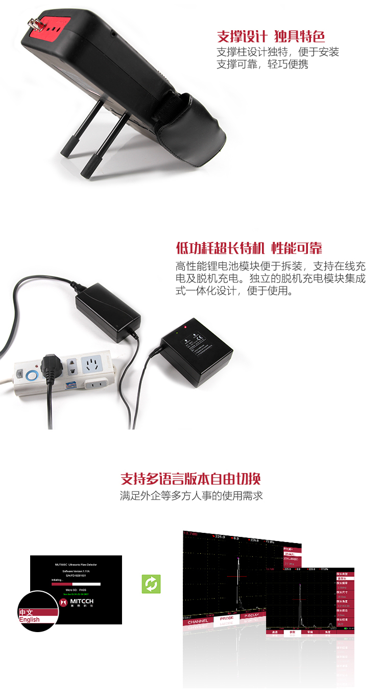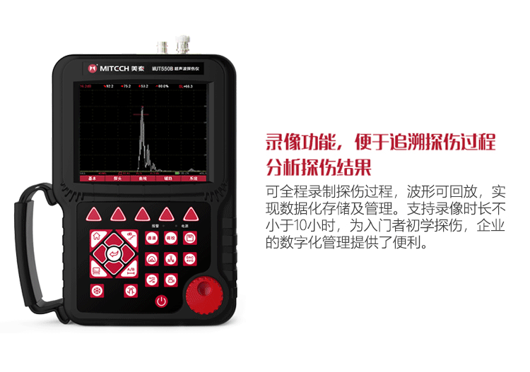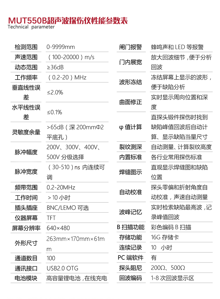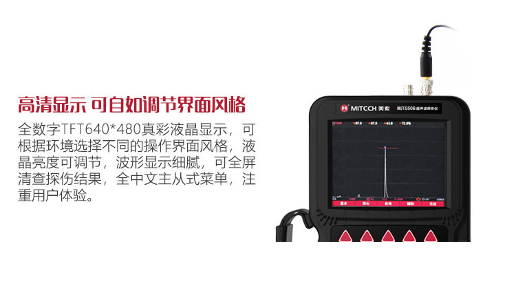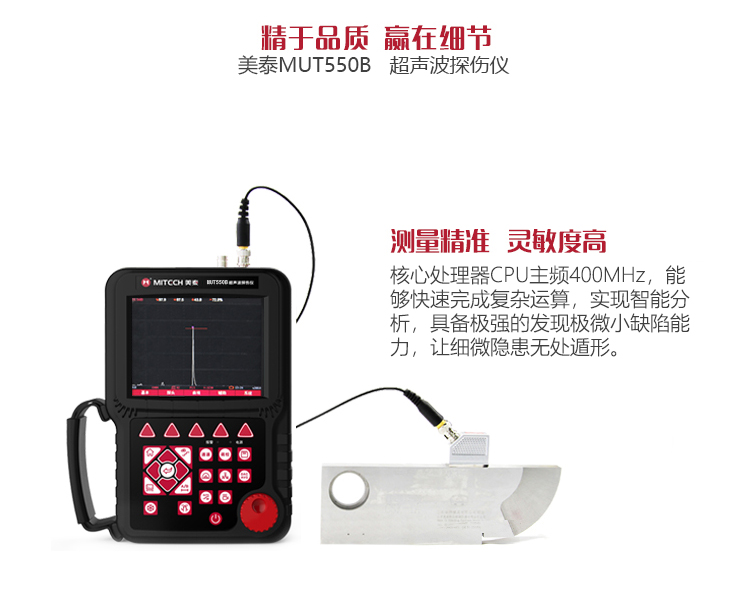 產(chǎn)品概述MUT550B數(shù)字式超聲波探傷儀依據(jù)超聲傳播原理,可精準(zhǔn)、靈敏地進行工件內(nèi)部多種缺陷(裂紋、夾雜、氣孔等)的檢測、定位、評估和診斷。采用全數(shù)字TFT640×480真彩色液晶顯示屏,在光線昏暗及日光強烈環(huán)境下都能為您呈現(xiàn)清晰缺陷;0-9999mm大量程可滿足制造業(yè)、鋼鐵冶金業(yè)、金屬加工業(yè)、化工業(yè)等常規(guī)的缺陷檢測需求;低功耗設(shè)計配備大容量高性能鋰離子電池模塊可連續(xù)工作10小時以上;全中文主從式菜單,注重用戶體驗,集快捷按鍵、數(shù)碼飛梭旋輪、十字菜單三種操作方式于一體,不同使用習(xí)慣均可操作自如;設(shè)有綜合性能指標(biāo)自檢功能,可自動生成測試報告,支持多語言。該產(chǎn)品具有很高的性價比,是實用經(jīng)濟款超聲檢測儀器的明智之選。