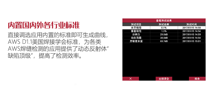 | AWS D1.1 | 美國焊接學(xué)會標(biāo)準(zhǔn),為各類AWS焊縫檢測應(yīng)用提供一個動態(tài)反射體“缺陷定級”。可避免手工計算,提高檢測效率。(可選) |