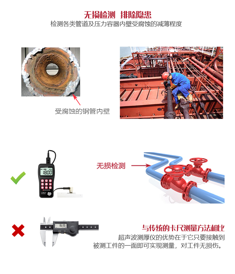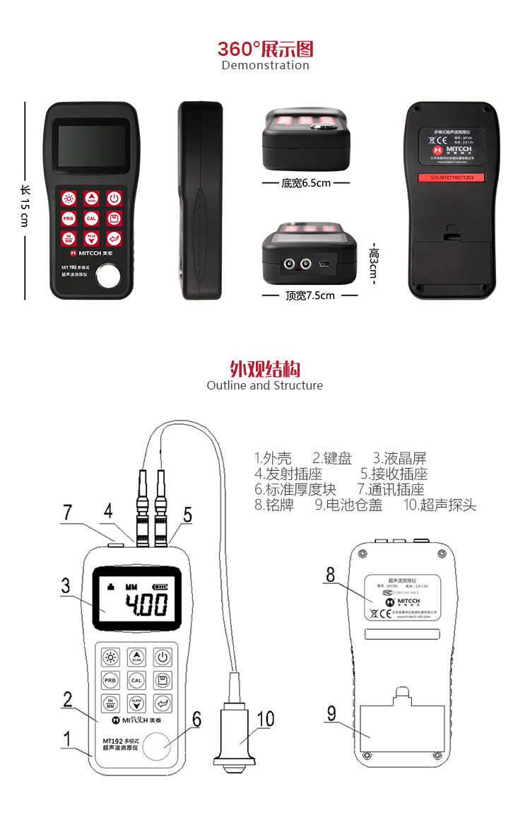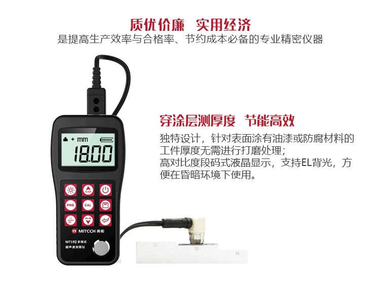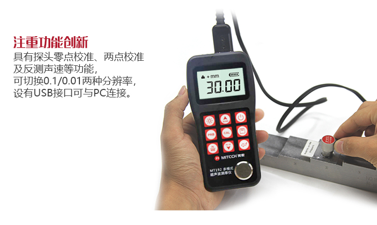 產(chǎn)品概述美泰MT192超聲波測(cè)厚儀,基于超聲波測(cè)量原理,可對(duì)金屬、塑料、陶瓷、玻璃及其他多種超聲波的良導(dǎo)體材料進(jìn)行厚度測(cè)量,也可實(shí)現(xiàn)對(duì)材料聲速的反測(cè)。與傳統(tǒng)的測(cè)量方法相比,超聲波測(cè)厚儀的優(yōu)勢(shì)在于它只要接觸到被測(cè)工件的一面即可完成測(cè)量,其獨(dú)特的可穿透涂層測(cè)厚度的性能為表面涂有油漆或防腐材料的工件厚度檢測(cè)提供了更加高效的解決方案,測(cè)量前無需處理掉表面的涂層,可以直接測(cè)量。被廣泛應(yīng)用于石油、化工、冶金、造船、航空、航天等領(lǐng)域的生產(chǎn)設(shè)備中各種管道及壓力容器腐蝕減薄程度的監(jiān)測(cè),也可用于對(duì)各種板材及各種加工零件做精確的測(cè)量。是提高生產(chǎn)效率與合格率、節(jié)約成本必備的專業(yè)精密儀器。