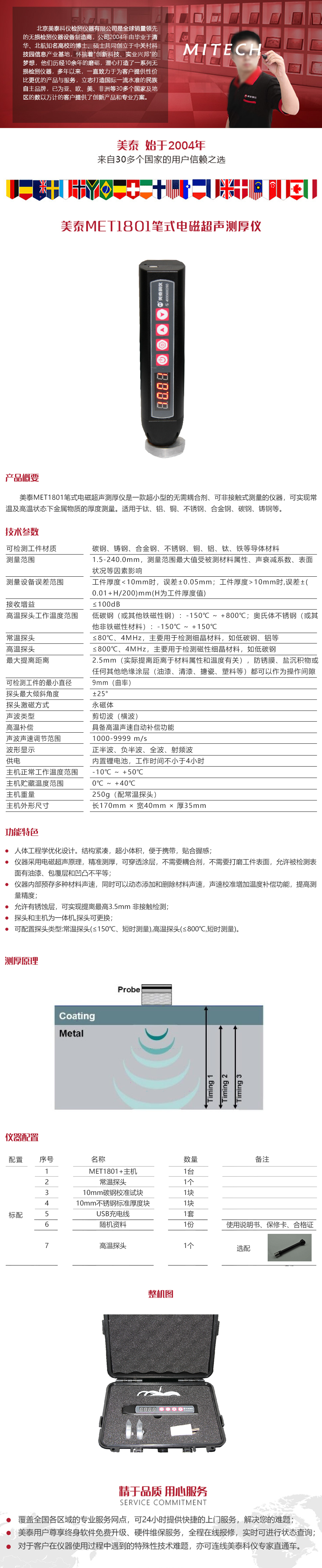 產(chǎn)品概述美泰MET1801筆式電磁超聲測厚儀是一款超小型的無需耦合劑、可非接觸式測量的儀器,可實現(xiàn)常溫及高溫狀態(tài)下金屬物質(zhì)的厚度測量。適用于鈦、鋁、銅、不銹鋼、合金鋼、碳鋼、鑄鋼等。