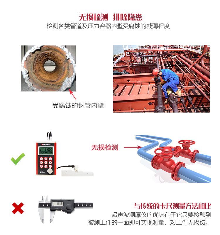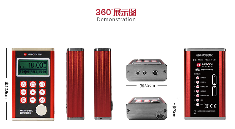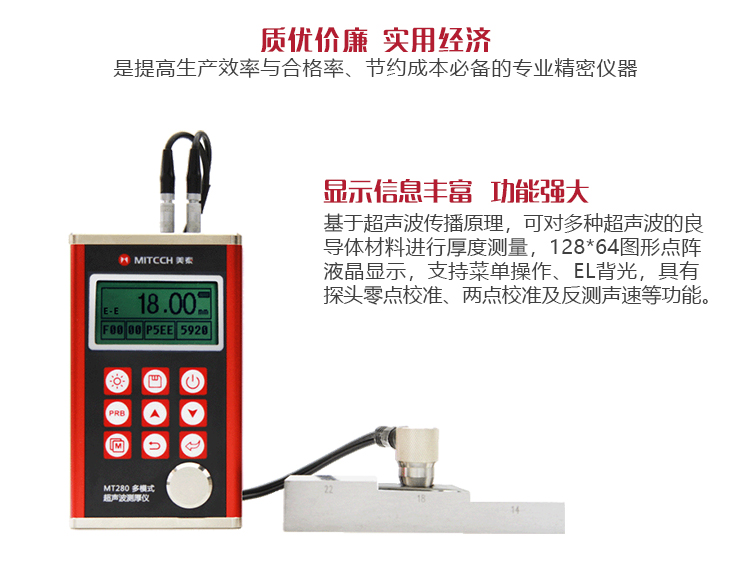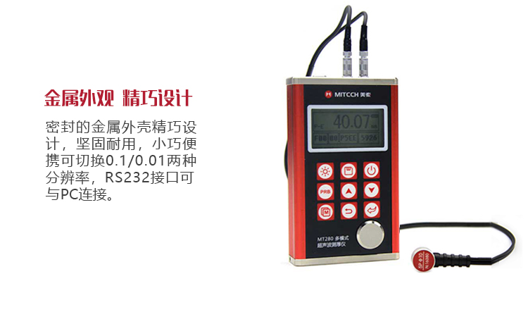 產(chǎn)品概述MT280超聲波測厚儀,基于超聲波測量原理,可對金屬、塑料、陶瓷、玻璃及其他多種超聲波的良導(dǎo)體材料進行厚度測量,也可實現(xiàn)對材料聲速的反測。密封的金屬外殼精巧設(shè)計,可防御惡劣現(xiàn)場環(huán)境中的油污、粉塵;與傳統(tǒng)的測量方法相比,超聲波測厚儀的優(yōu)勢在于它只要接觸到被測工件的一面即可完成測量,其獨特的無損檢測性能為封閉類管材、容器等厚度檢測受局限的工況提供了完美的解決方案。MT280兼?zhèn)浯┩竿繉幽J脚c普通模式雙效功能,測量前無需處理掉表面的涂層,可直接測量。被廣泛應(yīng)用于石油、化工、冶金、造船、航空、航天等領(lǐng)域的生產(chǎn)設(shè)備中各種管道及壓力容器腐蝕減薄程度的監(jiān)測,也可用于對各種板材及各種加工零件做精確的測量。是提高生產(chǎn)效率與合格率、節(jié)約成本必備的專業(yè)精密儀器。