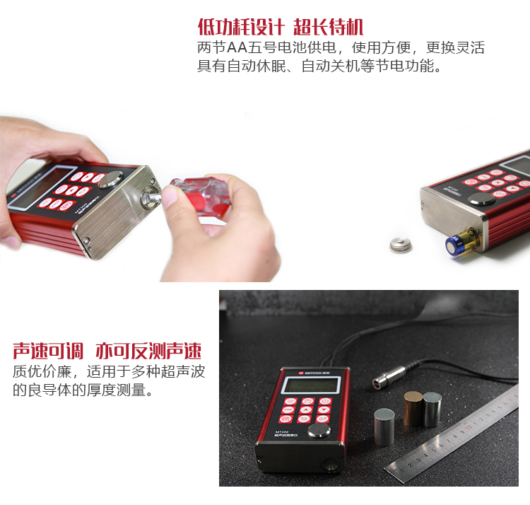 大容量存儲,低功耗設(shè)計,可超長待機數(shù)月以上已知厚度可以反測聲速,滿足多種材料的厚度檢測需求