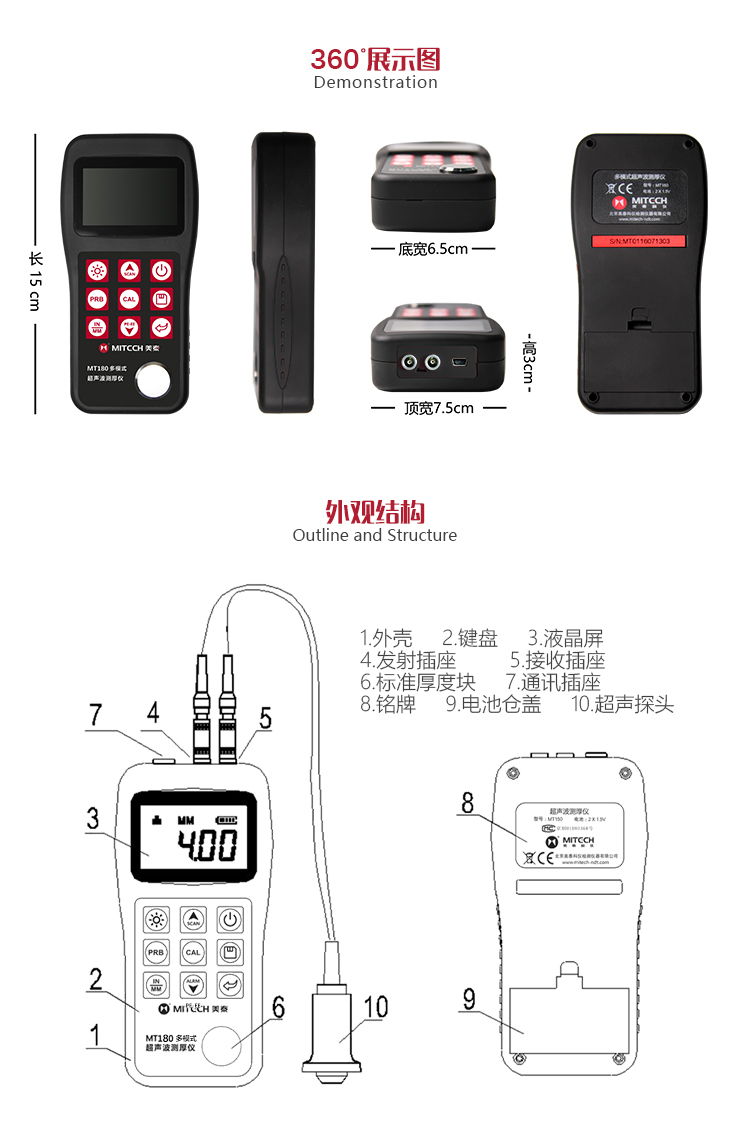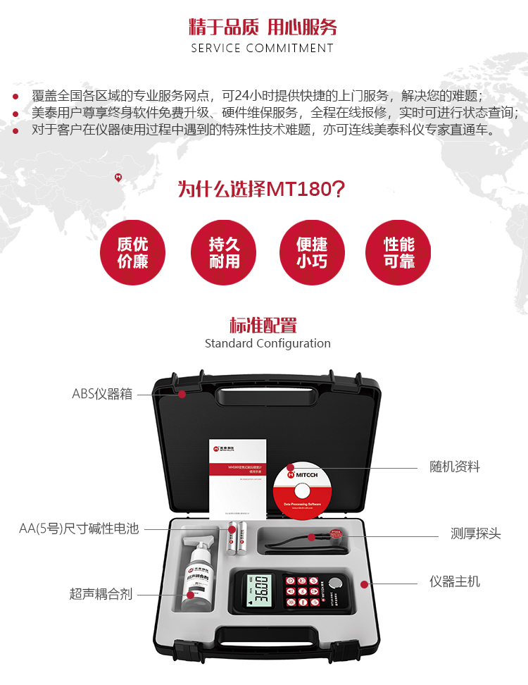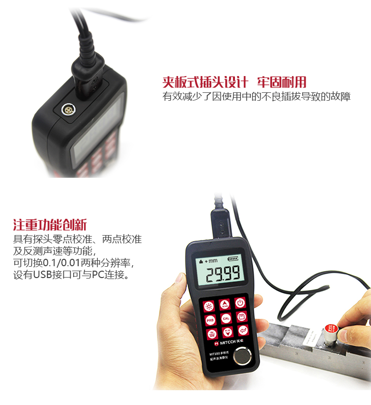產(chǎn)品概述美泰MT180 超聲波測(cè)厚儀,基于超聲波測(cè)量原理,可對(duì)金屬、塑料、陶瓷、玻璃及其他多種超聲波的良導(dǎo)體材料進(jìn)行厚度測(cè)量,也可實(shí)現(xiàn)對(duì)材料聲速的反測(cè)。與傳統(tǒng)的測(cè)量方法相比,超聲波測(cè)厚儀的優(yōu)勢(shì)在于它只要接觸到被測(cè)工件的一面即可完成測(cè)量,其獨(dú)特的可穿透涂層測(cè)厚度的性能為表面涂有油漆或防腐材料的工件厚度檢測(cè)提供了更加高效的解決方案,測(cè)量前無(wú)需處理掉表面的涂層,直接亦可測(cè)量。被廣泛應(yīng)用于石油、化工、冶金、造船、航空、航天等領(lǐng)域的生產(chǎn)設(shè)備中各種管道及壓力容器腐蝕減薄程度的監(jiān)測(cè),也可用于對(duì)各種板材及各種加工零件做精確的測(cè)量。是提高生產(chǎn)效率與合格率、節(jié)約成本必備的專業(yè)精密儀器。