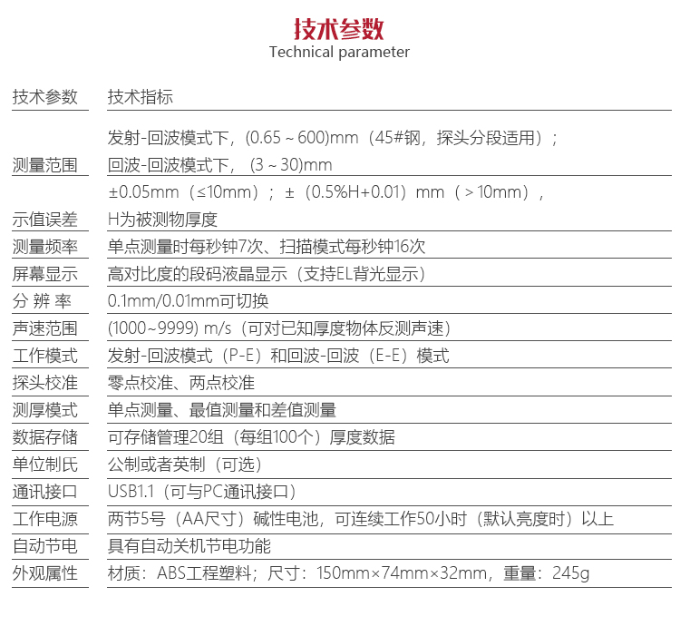可存儲(chǔ)20組(每組最多100個(gè)測(cè)量值)厚度測(cè)量數(shù)據(jù);通訊接口USB1.1
