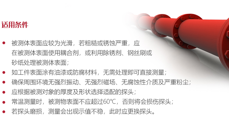 探頭表面為丙烯樹(shù)脂,對(duì)粗糙表面的重劃很敏感,因此在使用中應(yīng)輕按;測(cè)粗糙表面時(shí),盡量減少探頭在工作表面的劃動(dòng)。