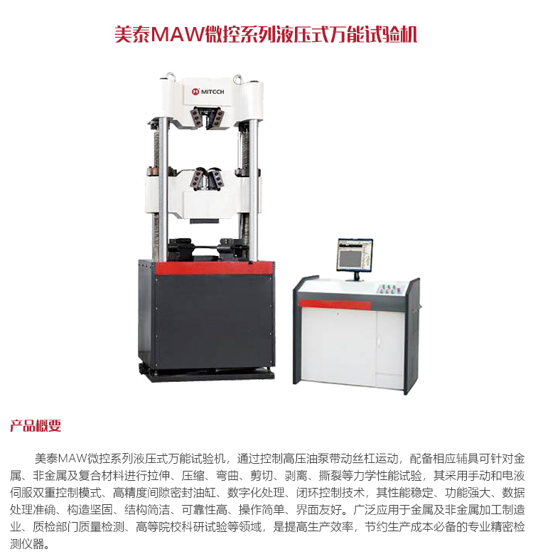 產(chǎn)品概述美泰MAW微控系列液壓式萬(wàn)能試驗(yàn)機(jī),通過(guò)控制高壓油泵帶動(dòng)絲杠運(yùn)動(dòng),配備相應(yīng)輔具可針對(duì)金屬、非金屬及復(fù)合材料進(jìn)行拉伸、壓縮、彎曲、剪切、剝離、撕裂等力學(xué)性能試驗(yàn),其采用手動(dòng)和電液伺服雙重控制模式、高精度間隙密封油缸、數(shù)字化處理、閉環(huán)控制技術(shù),其性能穩(wěn)定、功能強(qiáng)大、數(shù)據(jù)處理準(zhǔn)確、構(gòu)造堅(jiān)固、結(jié)構(gòu)簡(jiǎn)潔、可靠性高、操作簡(jiǎn)單、界面友好。廣泛應(yīng)用于金屬及非金屬加工制造業(yè)、質(zhì)檢部門質(zhì)量檢測(cè)、高等院校科研試驗(yàn)等領(lǐng)域,是提高生產(chǎn)效率,節(jié)約生產(chǎn)成本必備的專業(yè)精密檢測(cè)儀器。
