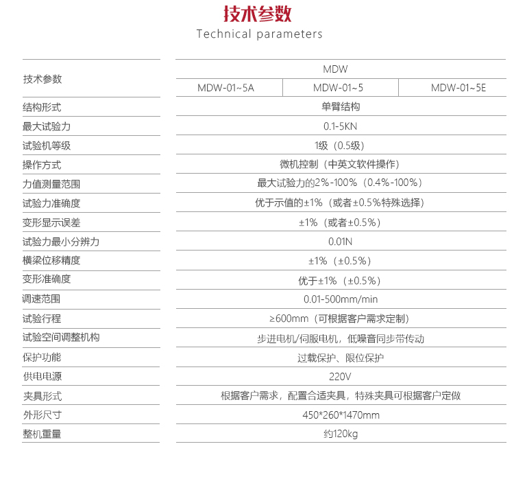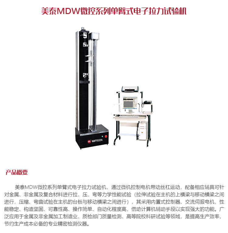 產(chǎn)品概述美泰MDW微控系列單臂式電子拉力試驗(yàn)機(jī),通過微機(jī)控制電機(jī)帶動(dòng)絲杠運(yùn)動(dòng),配備相應(yīng)輔具可針對(duì)金屬、非金屬及復(fù)合材料進(jìn)行拉、壓、彎等力學(xué)性能試驗(yàn)(拉伸試驗(yàn)在主機(jī)的上橫梁與移動(dòng)橫梁之間進(jìn)行,壓縮、彎曲試驗(yàn)在主機(jī)的臺(tái)板與移動(dòng)橫梁之間進(jìn)行),其采用內(nèi)置式控制器、交流伺服電機(jī),性能穩(wěn)定、構(gòu)造堅(jiān)固、可靠性高、操作簡(jiǎn)單、自動(dòng)化程度高,借助計(jì)算機(jī)輔助手段以實(shí)現(xiàn)強(qiáng)大的功能。廣泛應(yīng)用于金屬及非金屬加工制造業(yè)、質(zhì)檢部門質(zhì)量檢測(cè)、高等院??蒲性囼?yàn)等領(lǐng)域,是提高生產(chǎn)效率,節(jié)約生產(chǎn)成本必備的專業(yè)精密檢測(cè)儀器。