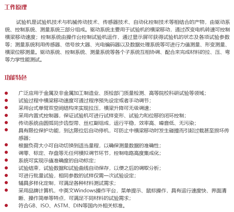 采用臺(tái)式單臂雙空間結(jié)構(gòu)來實(shí)現(xiàn)拉壓,橫梁升降可無級(jí)調(diào)速;