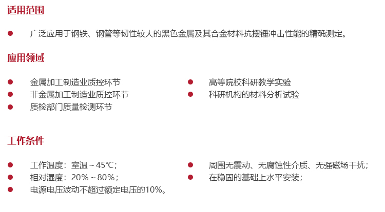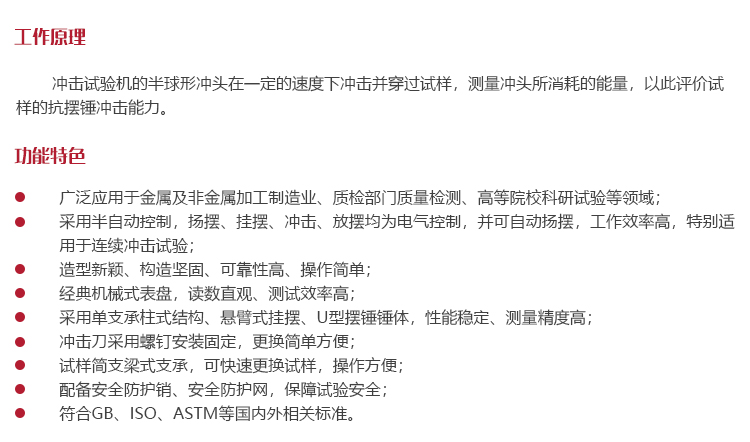 采用半自動(dòng)控制,揚(yáng)擺、掛擺、沖擊、放擺均為電氣控制,并可自動(dòng)揚(yáng)擺,工作效率高,特別適用于連續(xù)沖擊試驗(yàn);