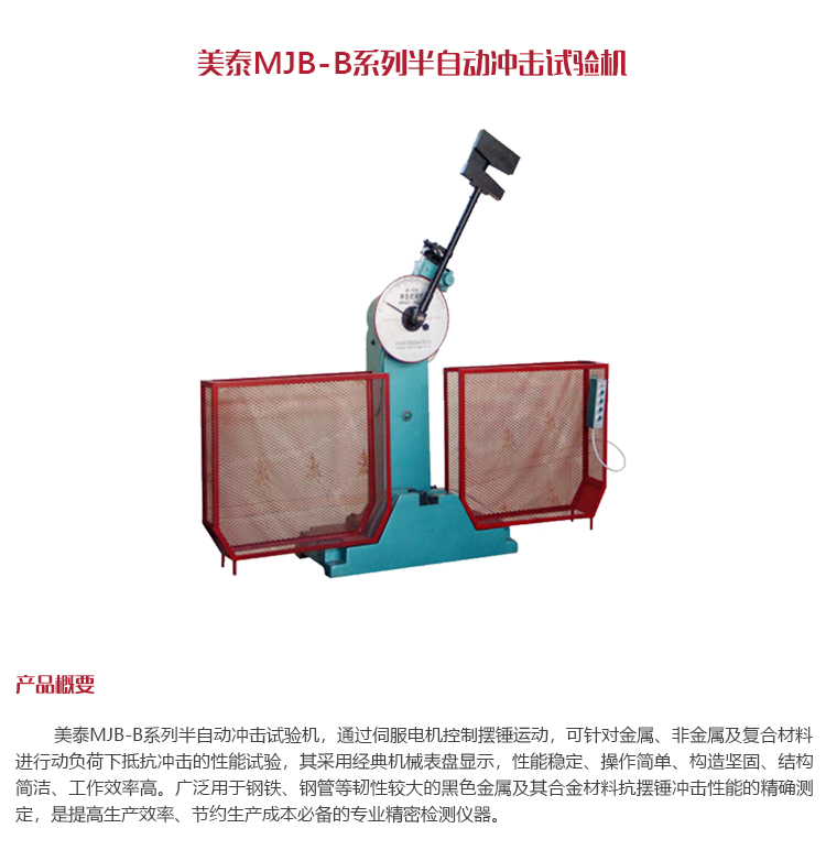 產(chǎn)品概述美泰MJB-B系列半自動(dòng)沖擊試驗(yàn)機(jī),通過伺服電機(jī)控制擺錘運(yùn)動(dòng),可針對金屬、非金屬及復(fù)合材料進(jìn)行動(dòng)負(fù)荷下抵抗沖擊的性能試驗(yàn),其采用經(jīng)典機(jī)械表盤顯示,性能穩(wěn)定、操作簡單、構(gòu)造堅(jiān)固、結(jié)構(gòu)簡潔、工作效率高。廣泛用于鋼鐵、鋼管等韌性較大的黑色金屬及其合金材料抗擺錘沖擊性能的精確測定,是提高生產(chǎn)效率、節(jié)約生產(chǎn)成本必備的專業(yè)精密檢測儀器。