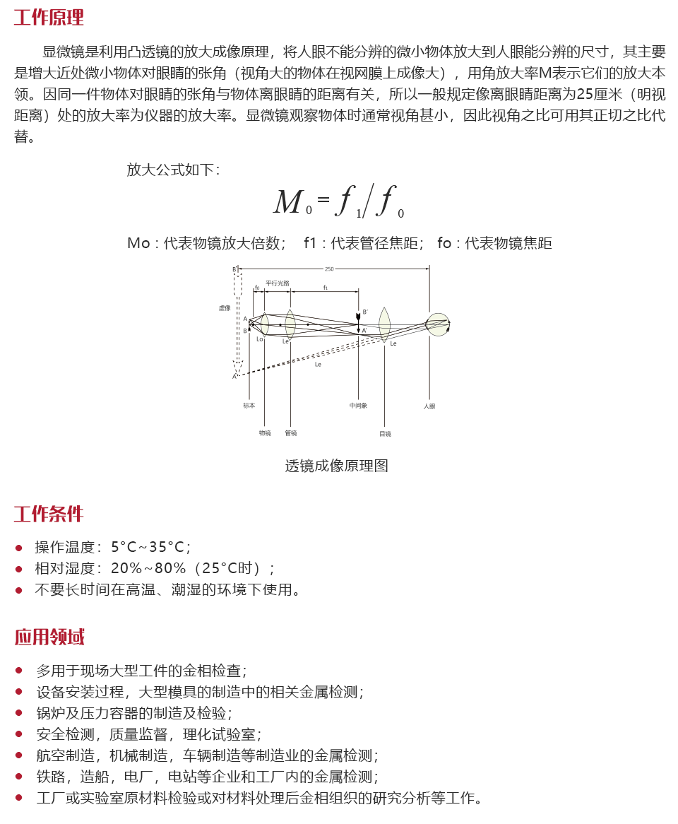 工作原理顯微鏡是利用凸透鏡的放大成像原理,將人眼不能分辨的微小物體放大到人眼能分辨的尺寸,其主要是增大近處微小物體對(duì)眼睛的張角(視角大的物體在視網(wǎng)膜上成像大),用角放大率M表示它們的放大本領(lǐng)。因同一件物體對(duì)眼睛的張角與物體離眼睛的距離有關(guān),所以一般規(guī)定像離眼睛距離為25厘米(明視距離)處的放大率為儀器的放大率。顯微鏡觀察物體時(shí)通常視角甚小,因此視角之比可用其正切之比代替。