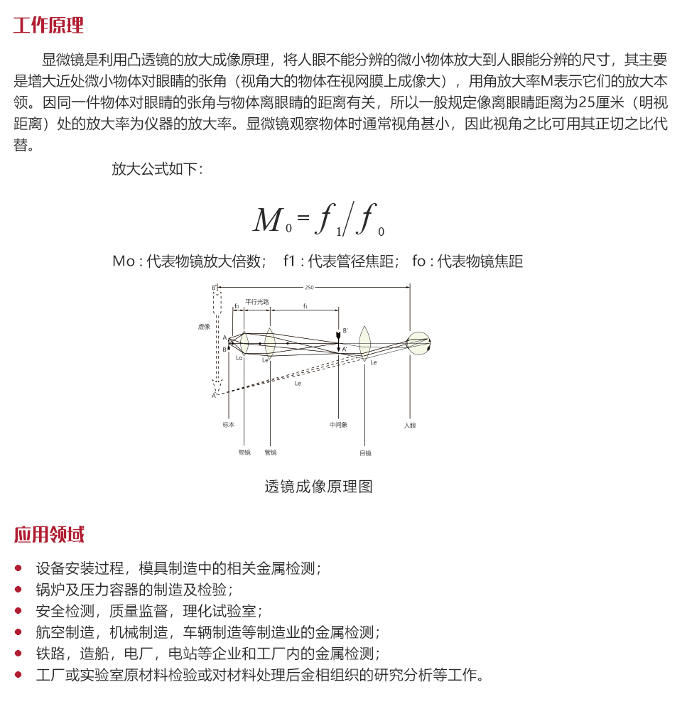顯微鏡是利用凸透鏡的放大成像原理,將人眼不能分辨的微小物體放大到人眼能分辨的尺寸,其主要是增大近處微小物體對眼睛的張角(視角大的物體在視網(wǎng)膜上成像大),用角放大率M表示它們的放大本領(lǐng)。因同一件物體對眼睛的張角與物體離眼睛的距離有關(guān),所以一般規(guī)定像離眼睛距離為25厘米(明視距離)處的放大率為儀器的放大率。顯微鏡觀察物體時通常視角甚小,因此視角之比可用其正切之比代替。