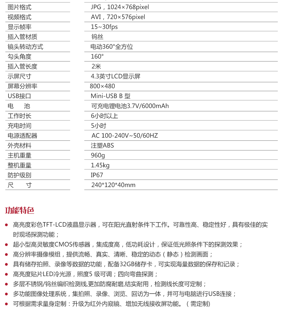 產(chǎn)品概述美泰MVD8850工業(yè)內(nèi)窺鏡,基于CMOS圖像傳感器成像原理,能夠對人眼無法進行直接觀察的區(qū)域進行拍攝成像,并使結(jié)果高清顯示,從而實現(xiàn)無損檢測。美泰MVD8850內(nèi)窺鏡是一款高精度視頻電子工業(yè)內(nèi)窺鏡,采用彩色液晶顯示器以及高集成度CMOS圖像傳感器保證了視頻內(nèi)窺鏡影像的清晰、逼真;其功耗小,信號傳輸速度快,攜帶方便,操作簡易。可在不拆卸或不破壞組裝并停止設(shè)備運行的情況下對各種工業(yè)管路或復(fù)雜狹小的設(shè)備內(nèi)部空間的腐蝕、裂紋、焊縫、異物、磨損及零部件內(nèi)部的加工等情況進行全面細致的檢測。被廣泛應(yīng)用于航天航空、石油化工、機械鑄造、國防軍事、電力生產(chǎn)、汽車交通等眾多領(lǐng)域,是工業(yè)設(shè)備檢測和維修等環(huán)節(jié)中重要的探測監(jiān)控儀器。