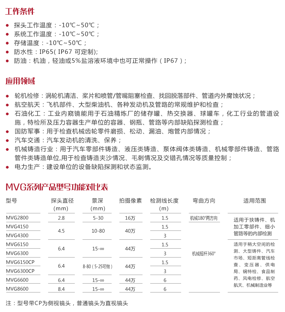 美泰MVG系列工業(yè)內(nèi)窺鏡,基于CMOS圖像傳感器成像原理,能夠對人眼無法進(jìn)行直接觀察的區(qū)域進(jìn)行拍攝成像,高清顯示,從而實現(xiàn)無損檢測。美泰MVG系列內(nèi)窺鏡是一款高精度視頻電子工業(yè)內(nèi)窺鏡,采用彩色液晶顯示器以及高集成度CMOS圖像傳感器保證了視頻內(nèi)窺鏡影像的清晰、逼真;功耗小,信號傳輸速度快,攜帶方便,操作簡易,可更換不同直徑檢測線,實現(xiàn)一機多用,節(jié)約成本。可在不拆卸或不破壞組裝并停止設(shè)備運行的情況下對各種工業(yè)管路或復(fù)雜狹小的設(shè)備內(nèi)部空間的腐蝕、裂紋、焊縫、異物、磨損及零部件內(nèi)部的加工等情況進(jìn)行全面細(xì)致的檢測。被廣泛應(yīng)用于航天航空、石油化工、機械鑄造、國防軍事、電力生產(chǎn)、汽車交通等眾多領(lǐng)域,是工業(yè)設(shè)備檢測和維修等環(huán)節(jié)中重要的探測監(jiān)控儀器。