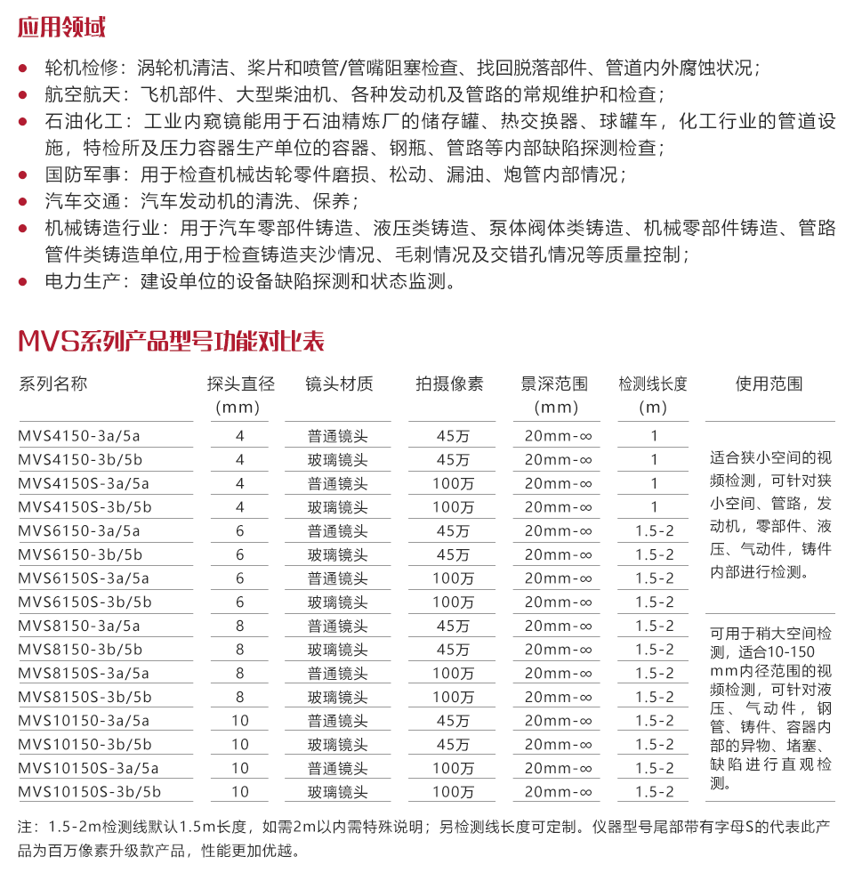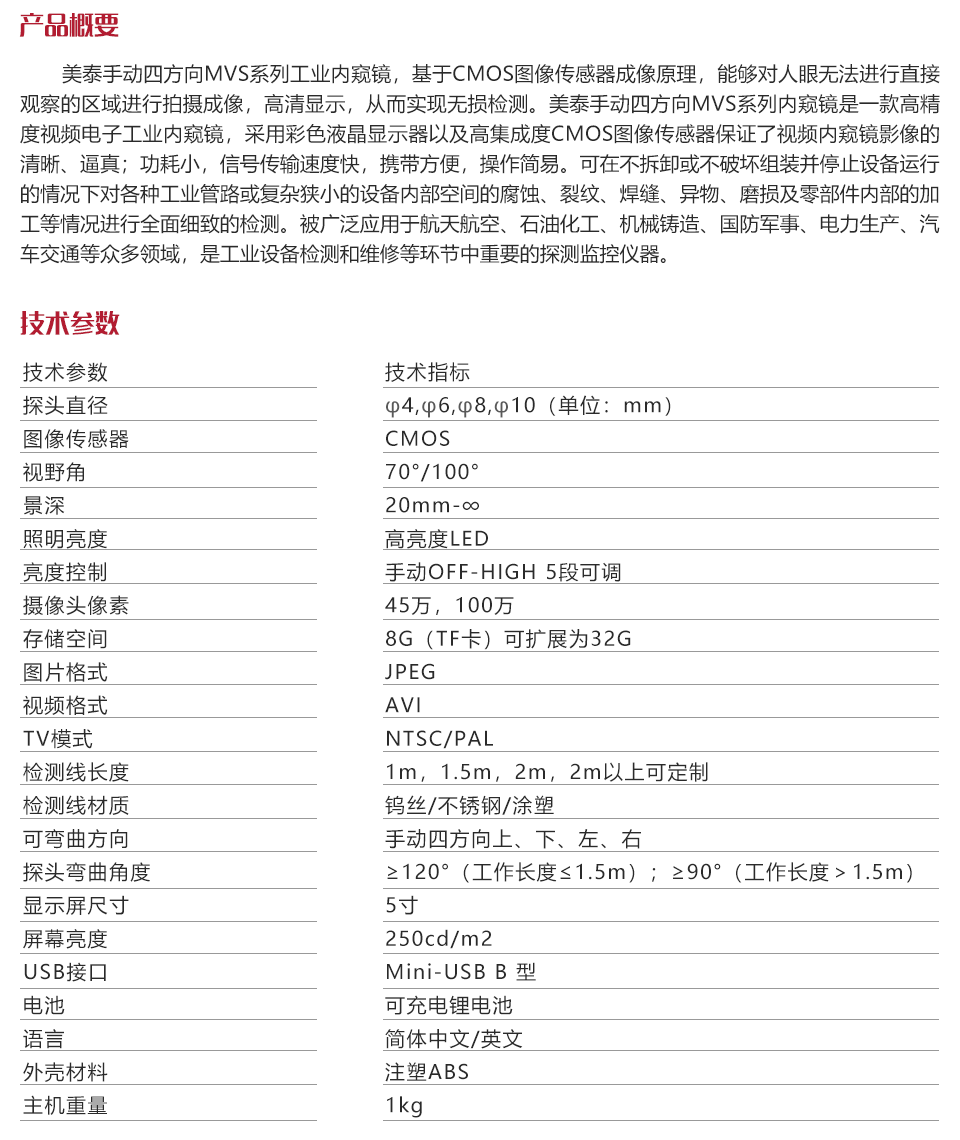 產(chǎn)品概述美泰手動(dòng)四方向MVS系列工業(yè)內(nèi)窺鏡,基于CMOS圖像傳感器成像原理,能夠對(duì)人眼無(wú)法進(jìn)行直接觀察的區(qū)域進(jìn)行拍攝成像,高清顯示,從而實(shí)現(xiàn)無(wú)損檢測(cè)。美泰手動(dòng)四方向MVS系列內(nèi)窺鏡是一款高精度視頻電子工業(yè)內(nèi)窺鏡,采用彩色液晶顯示器以及高集成度CMOS圖像傳感器保證了視頻內(nèi)窺鏡影像的清晰、逼真;功耗小,信號(hào)傳輸速度快,攜帶方便,操作簡(jiǎn)易。可在不拆卸或不破壞組裝并停止設(shè)備運(yùn)行的情況下對(duì)各種工業(yè)管路或復(fù)雜狹小的設(shè)備內(nèi)部空間的腐蝕、裂紋、焊縫、異物、磨損及零部件內(nèi)部的加工等情況進(jìn)行全面細(xì)致的檢測(cè)。被廣泛應(yīng)用于航天航空、石油化工、機(jī)械鑄造、國(guó)防軍事、電力生產(chǎn)、汽車(chē)交通等眾多領(lǐng)域,是工業(yè)設(shè)備檢測(cè)和維修等環(huán)節(jié)中重要的探測(cè)監(jiān)控儀器。