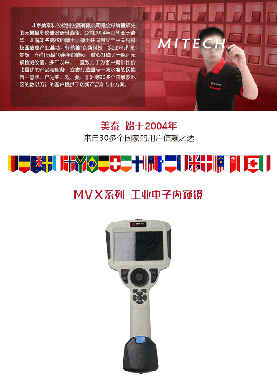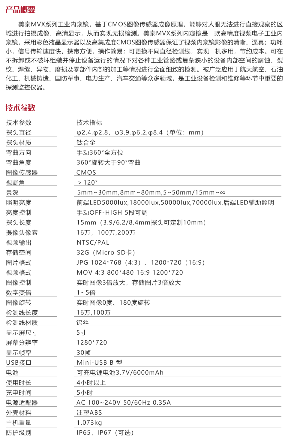 美泰MVX系列工業(yè)內(nèi)窺鏡,基于CMOS圖像傳感器成像原理,能夠對人眼無法進行直接觀察的區(qū)域進行拍攝成像,高清顯示,從而實現(xiàn)無損檢測。美泰MVX系列內(nèi)窺鏡是一款高精度視頻電子工業(yè)內(nèi)窺鏡,采用彩色液晶顯示器以及高集成度CMOS圖像傳感器保證了視頻內(nèi)窺鏡影像的清晰、逼真;功耗小,信號傳輸速度快,攜帶方便,操作簡易;可更換不同直徑檢測線,實現(xiàn)一機多用,節(jié)約成本??稍?/span>不拆卸或不破壞組裝并停止設(shè)備運行的情況下對各種工業(yè)管路或復(fù)雜狹小的設(shè)備內(nèi)部空間的腐蝕、裂紋、焊縫、異物、磨損及零部件內(nèi)部的加工等情況進行全面細致的檢測。被廣泛應(yīng)用于航天航空、石油化工、機械鑄造、國防軍事、電力生產(chǎn)、汽車交通等眾多領(lǐng)域,是工業(yè)設(shè)備檢測和維修等環(huán)節(jié)中重要的探測監(jiān)控儀器。