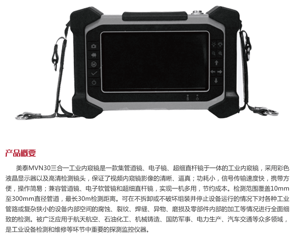美泰MVN30三合一工業(yè)內(nèi)窺鏡是一款集管道鏡、電子鏡、超細(xì)直桿鏡于一體的工業(yè)內(nèi)窺鏡,采用彩色液晶顯示器以及高請檢測鏡頭、保證了視頻內(nèi)窺鏡影像的清晰、逼真;功耗小,信號傳輸速度快,攜帶方便,操作簡易;兼容管道鏡、電子軟管鏡和超細(xì)直桿鏡,實(shí)現(xiàn)一機(jī)多用,節(jié)約成本。檢測范圍覆蓋10mm至300mm直徑管道,最長30m檢測距離。可在不拆卸或不破壞組裝并停止設(shè)備運(yùn)行的情況下對各種工業(yè)管路或復(fù)雜狹小的設(shè)備內(nèi)部空間的腐蝕、裂紋、焊縫、異物、磨損及零部件內(nèi)部的加工等情況進(jìn)行全面細(xì)致的檢測。被廣泛應(yīng)用于航天航空、石油化工、機(jī)械鑄造、國防軍事、電力生產(chǎn)、汽車交通等眾多領(lǐng)域,是工業(yè)設(shè)備檢測和維修等環(huán)節(jié)中重要的探測監(jiān)控儀器。