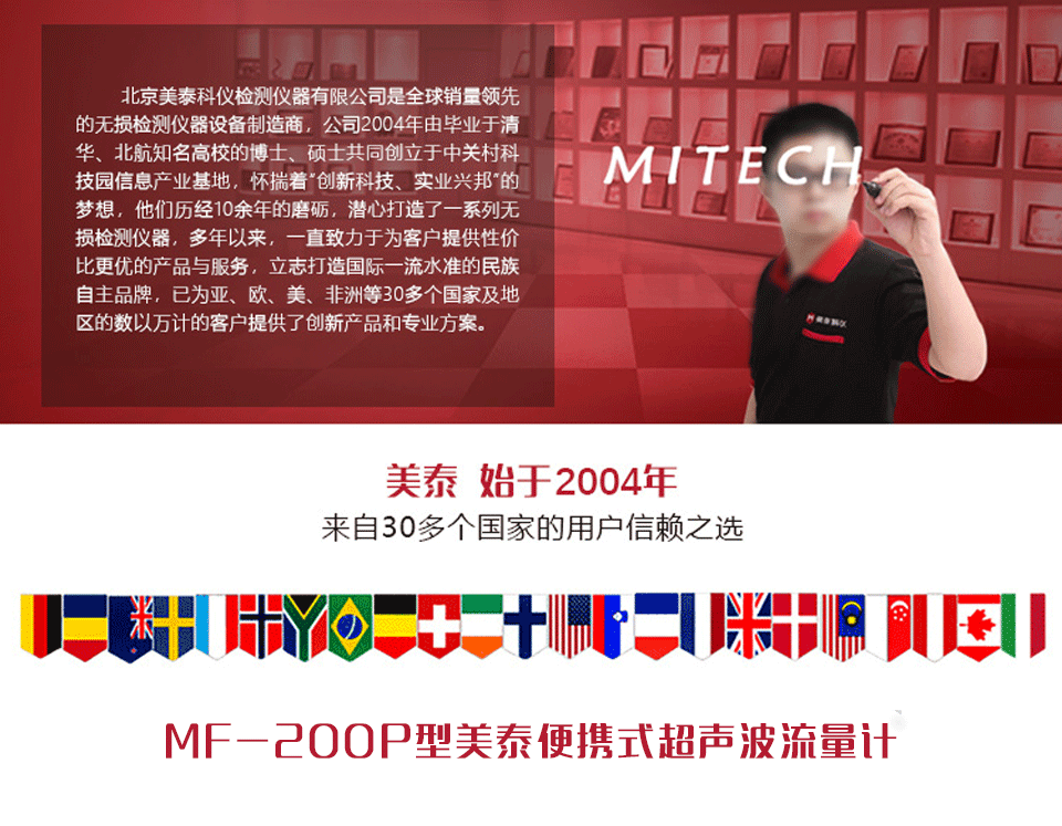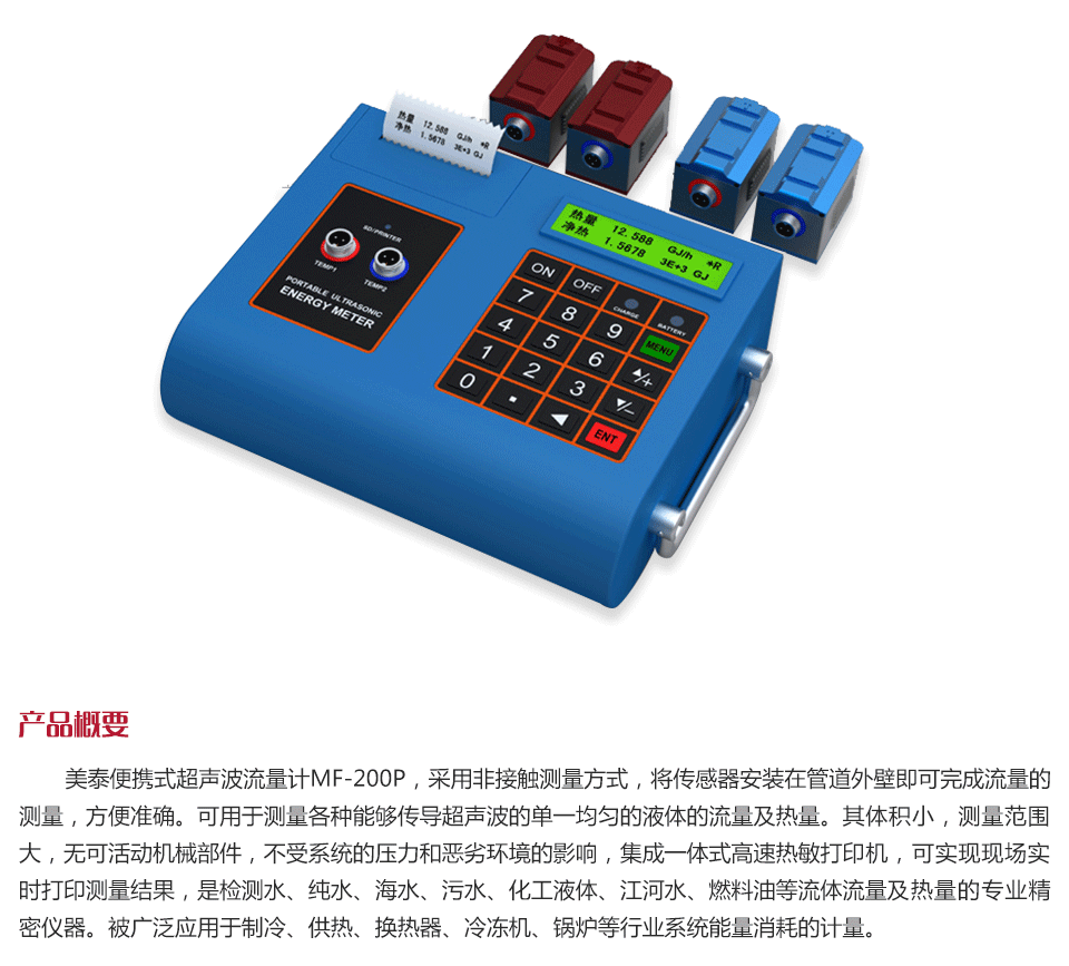 產品概述美泰便攜式超聲波流量計MF-200P,采用非接觸測量方式,將傳感器安裝在管道外壁即可完成流量的測量,方便準確??捎糜跍y量各種能夠傳導超聲波的單一均勻的液體的流量及熱量。其體積小,測量范圍大,無可活動機械部件,不受系統(tǒng)的壓力和惡劣環(huán)境的影響,集成一體式高速熱敏打印機,可實現現場實時打印測量結果,是檢測水、純水、海水、污水、化工液體、江河水、燃料油等流體流量及熱量的專業(yè)精密儀器。被廣泛應用于制冷、供熱、換熱器、冷凍機、鍋爐等行業(yè)系統(tǒng)能量消耗的計量。